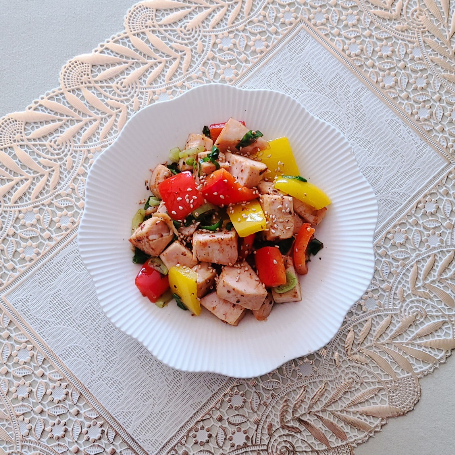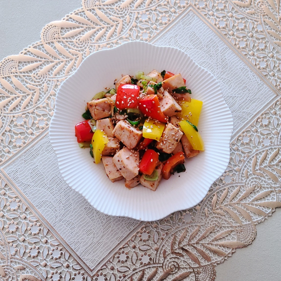 시판용 닭가슴살 100 g , 빨간 파프리카 30 g , 노란 파프리카 30 g , 대파 15 g , 다진마늘 0.5 큰술 , 굴소스 0.3 큰술 , 통깨 솔솔솔 , 후춧가루 톡톡톡 , 올리브오일 2 큰술