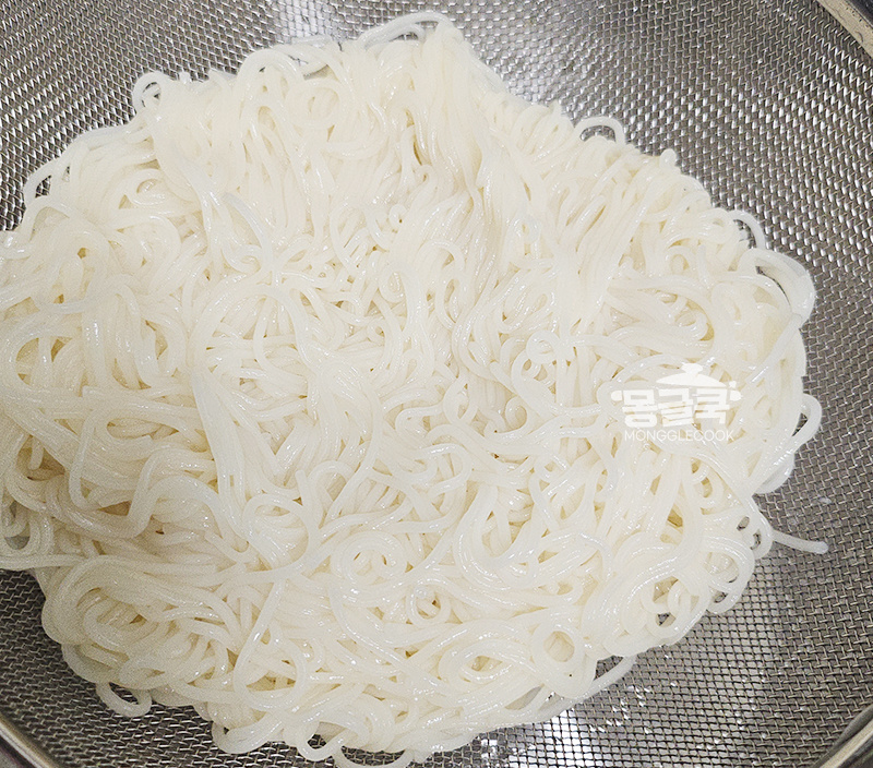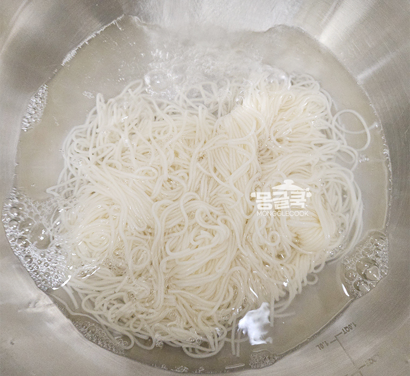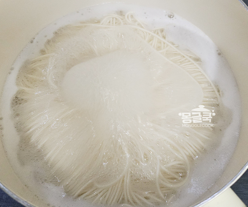 끓는 물에 소면을 넣고 3분~3분 30초 정도 삶아주세요.