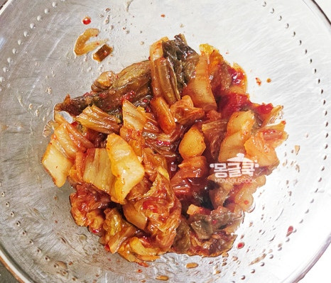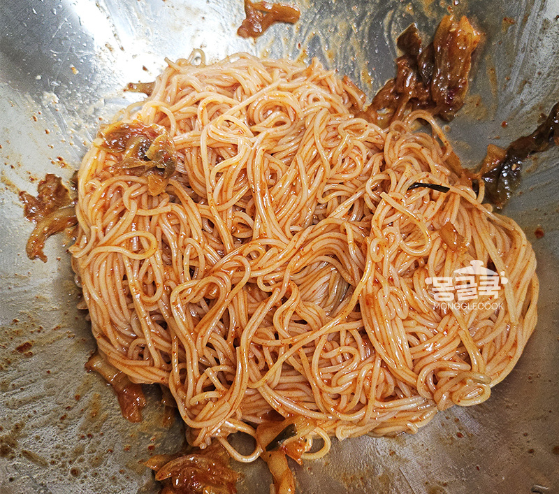 김치와 양념장을 넣고 골고루 비벼주세요.