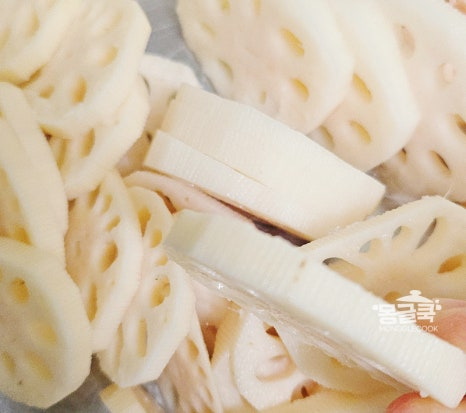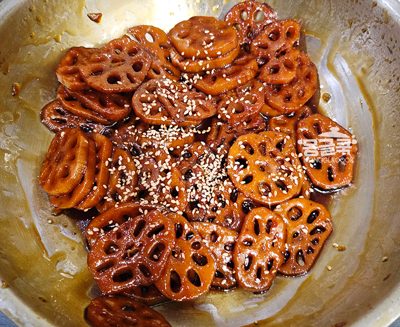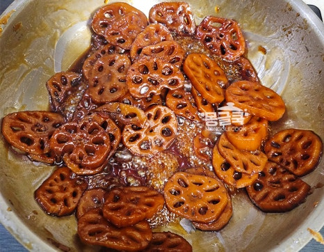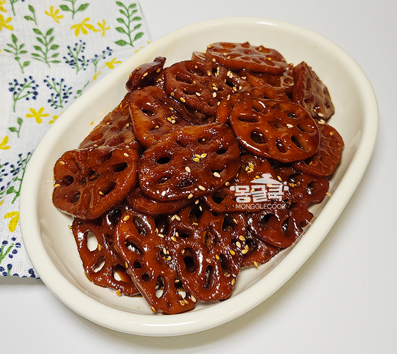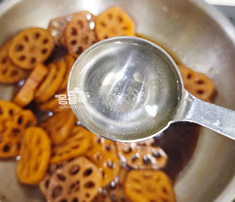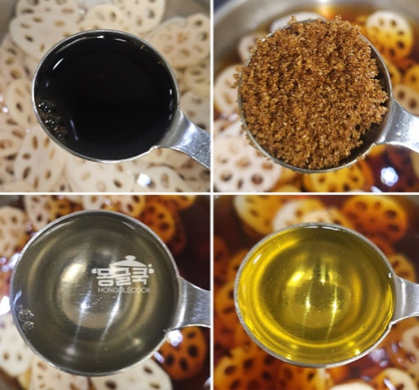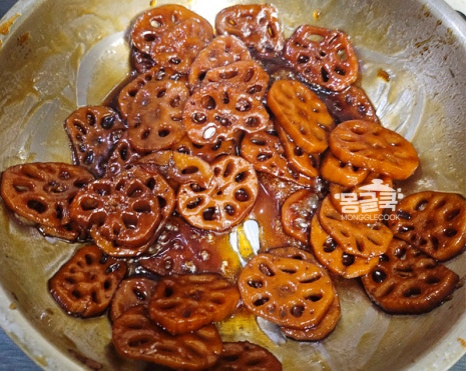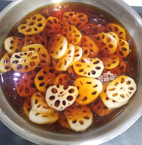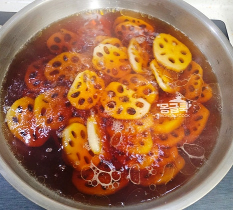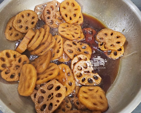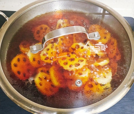 조청은 반드시 연근이 충분히 부드러워진 후에 넣어야 해요. 만약 이 단계에서 연근이 아직 단단하다면 물을 조금 더 추가해서라도 더 졸여주세요.