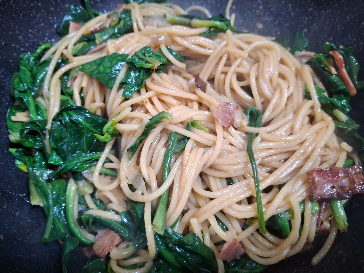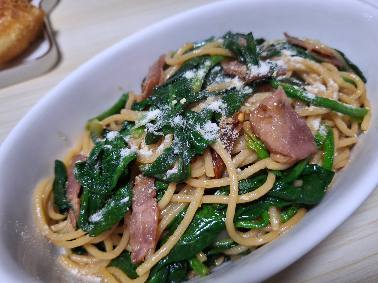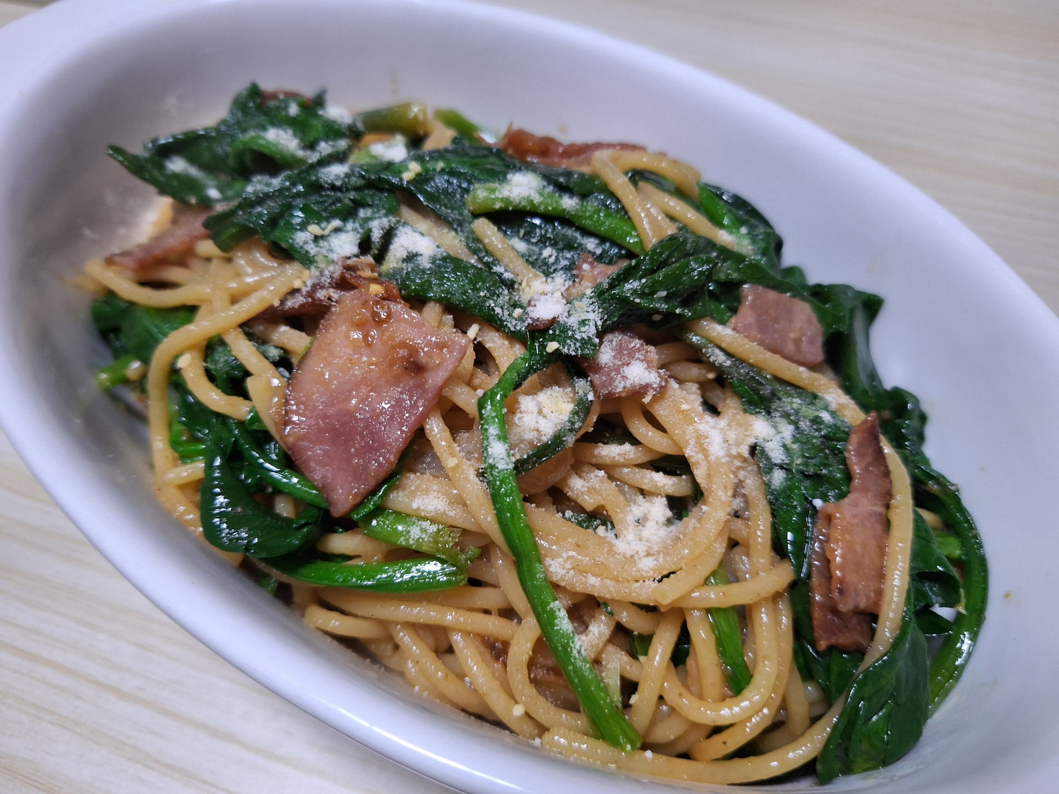 시금치 300 g , 양파 1/2 개 , 베이컨 6 장 , 파스타면 155 g , 다진마늘 1.5 큰숟갈 , 올리브유 8 큰숟갈 , 페페론치노 3 개 , 참치액 1 숟갈 , 굴소스 1 숟갈 (입맛에 따라 조절), 치킨스톡 1 숟갈 (입맛에 따라 조절), 맛소금 1/2 티스푼 , 후추 1/2 티스푼 , 면수 2 국자 , 파마산치즈가루 1/2 숟갈