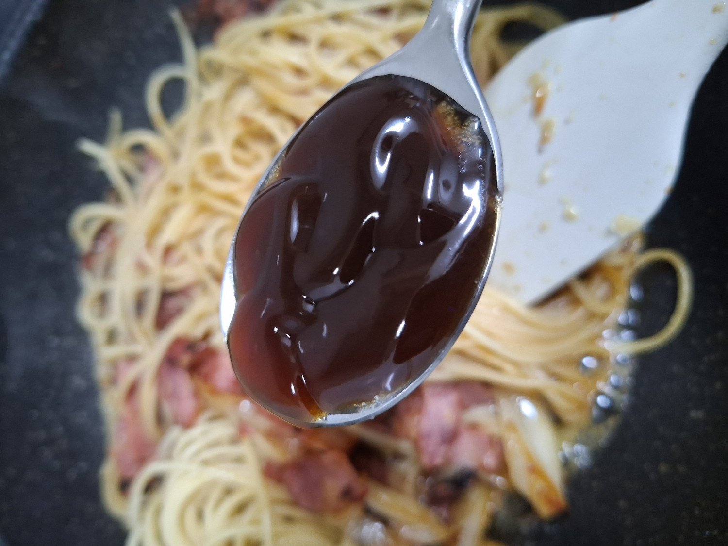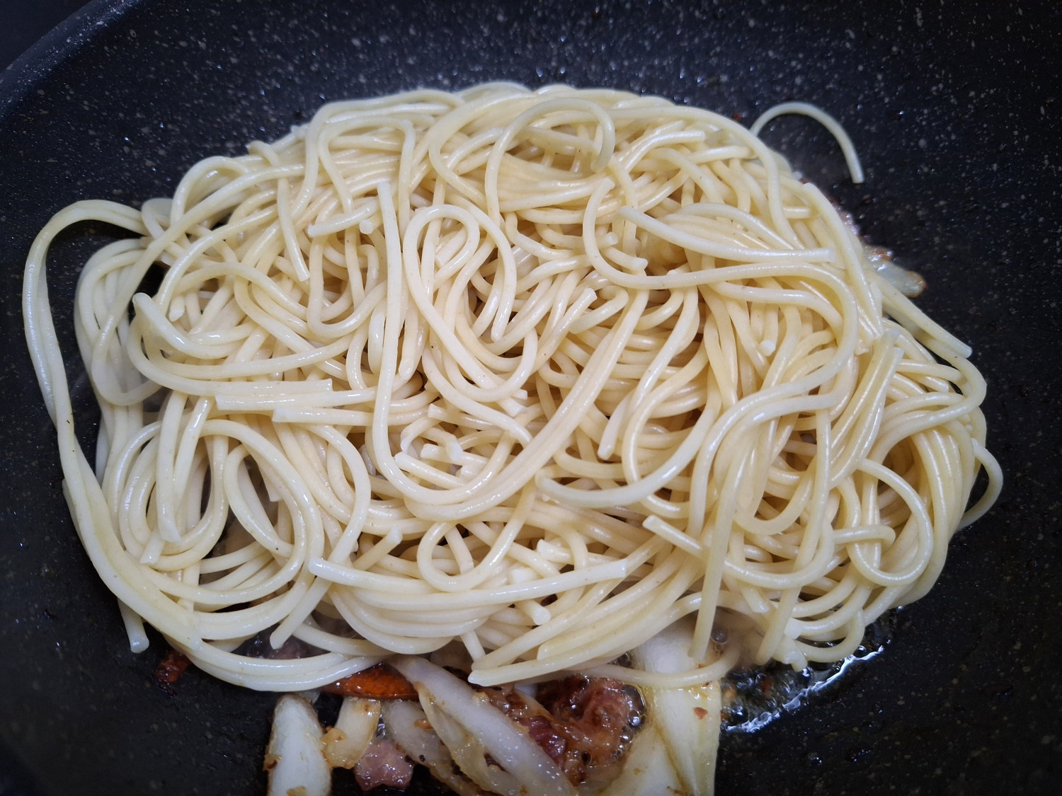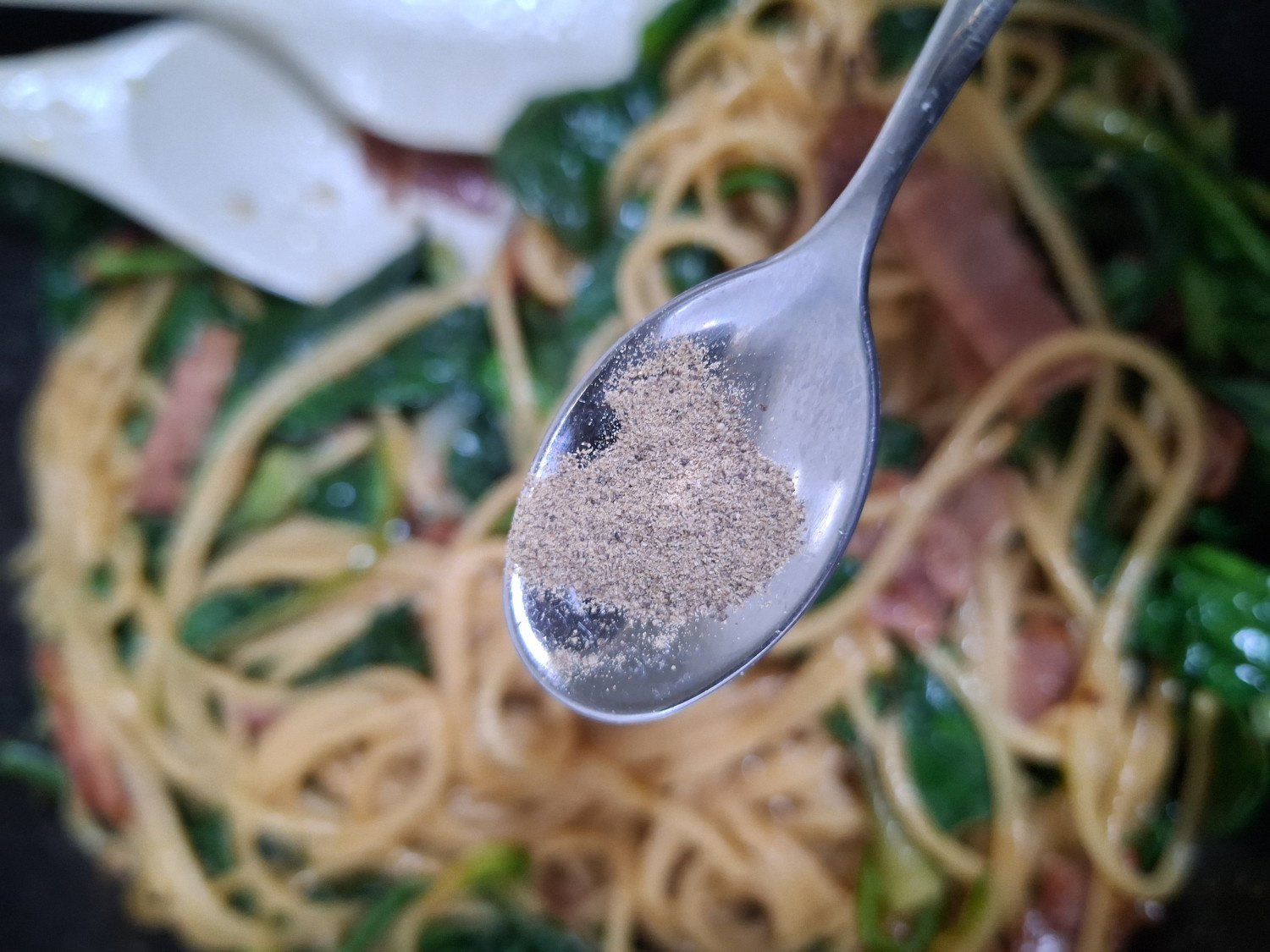 시금치 300 g , 양파 1/2 개 , 베이컨 6 장 , 파스타면 155 g , 다진마늘 1.5 큰숟갈 , 올리브유 8 큰숟갈 , 페페론치노 3 개 , 참치액 1 숟갈 , 굴소스 1 숟갈 (입맛에 따라 조절), 치킨스톡 1 숟갈 (입맛에 따라 조절), 맛소금 1/2 티스푼 , 후추 1/2 티스푼 , 면수 2 국자 , 파마산치즈가루 1/2 숟갈