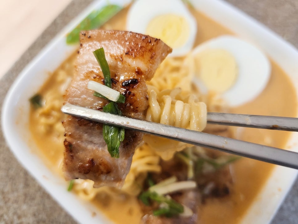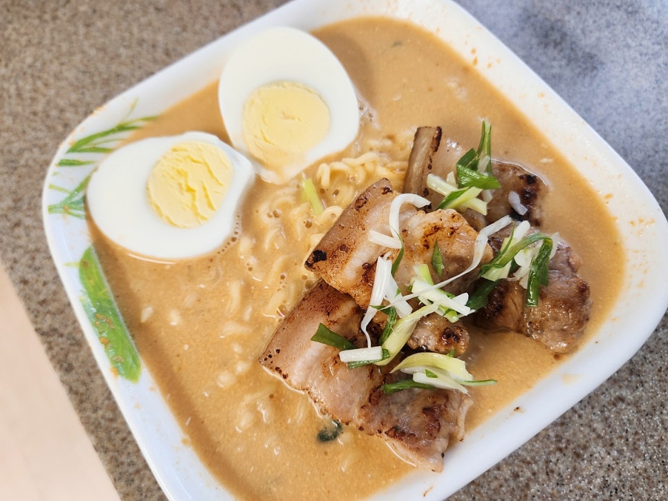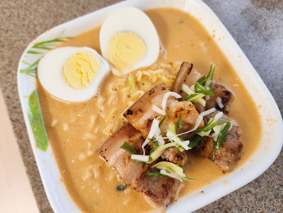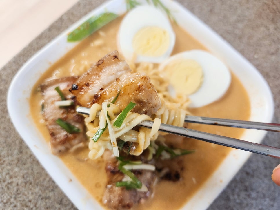 보기엔 일본 라멘 처럼 생기긴했지만 다진마늘이 들어가서 마늘의 향이 느껴지는 깊은 국물 맛의 라면 이랍니다 ㅎㅎ