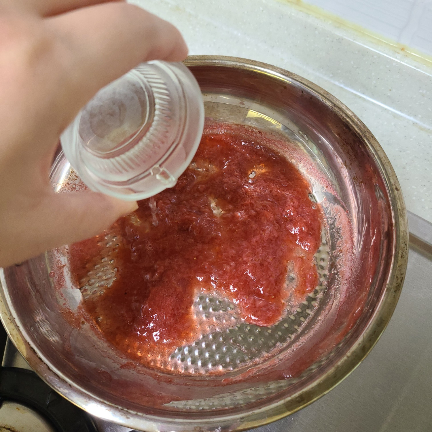 딸기퓨레를 체에 내리고 연하 퍼펙트 푸디 반 포(1g)을 빠르게 따뜻할 때 잘 섞어줍니다