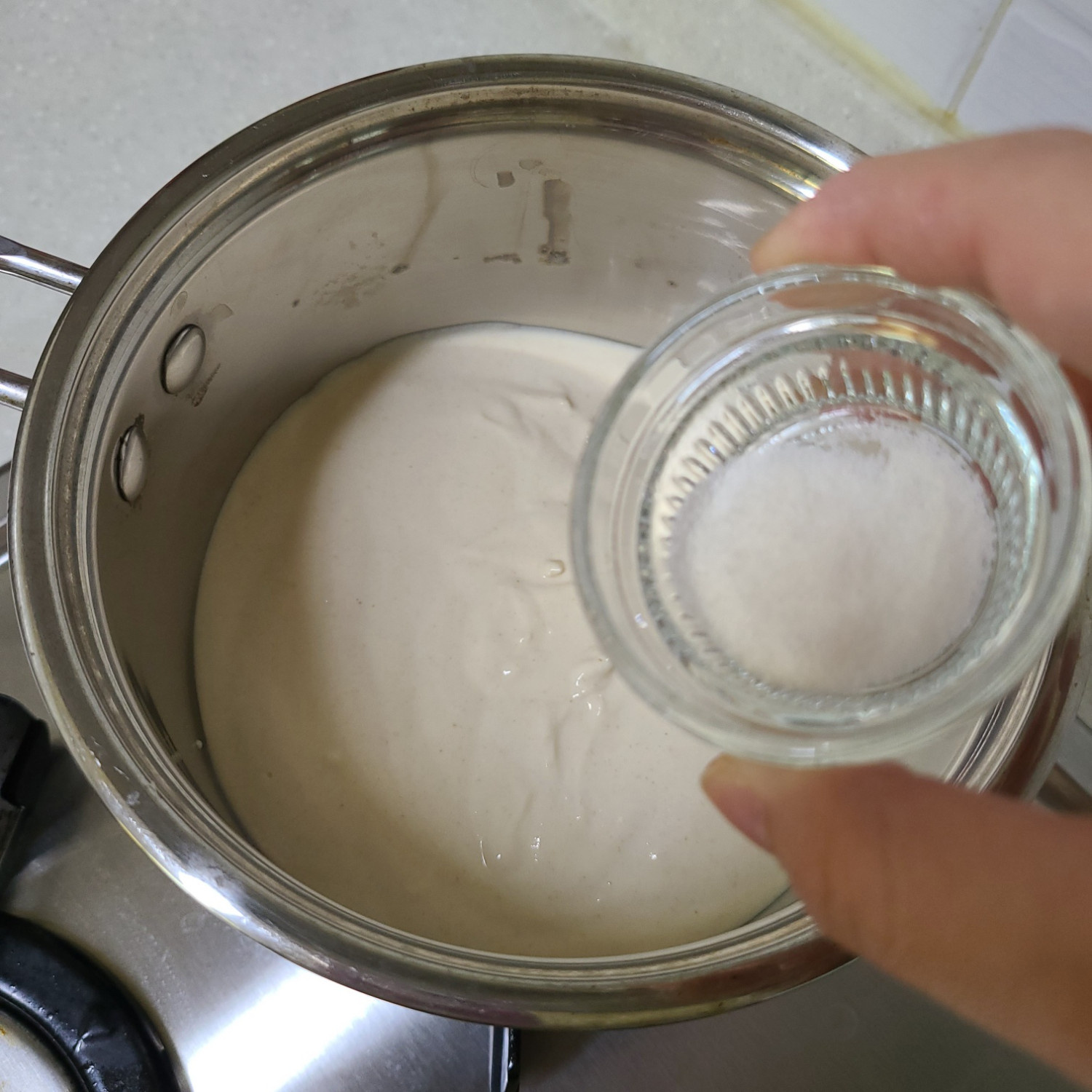 약불로 끓이다가 내용물이 튀어오르면 불 끄고 연하퍼펙트 푸디 반 포(1g)넣어서 빠르게 섞어 혀로도 으깨지는 제형으로 만들어줍니다