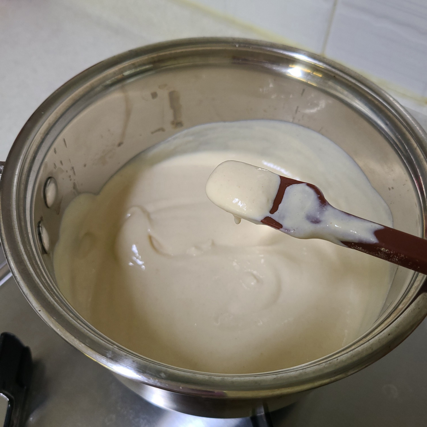 스패츌라로 으깨면서 완전히 물러질 때까지, 약불로 해서 끓어오른 기점으로 부터 3~4분 끓여주세요