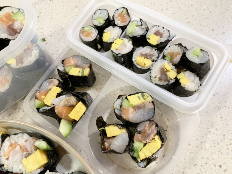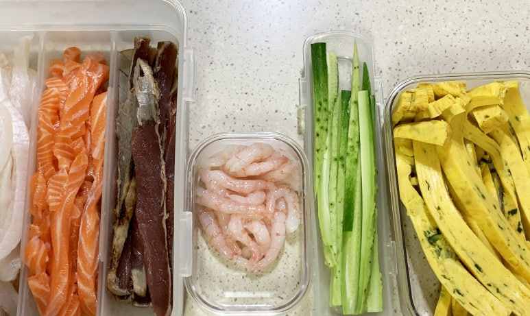 각종 회와 계란말이, 오이만 넣어서 만들어서 담아 놓았습니다.