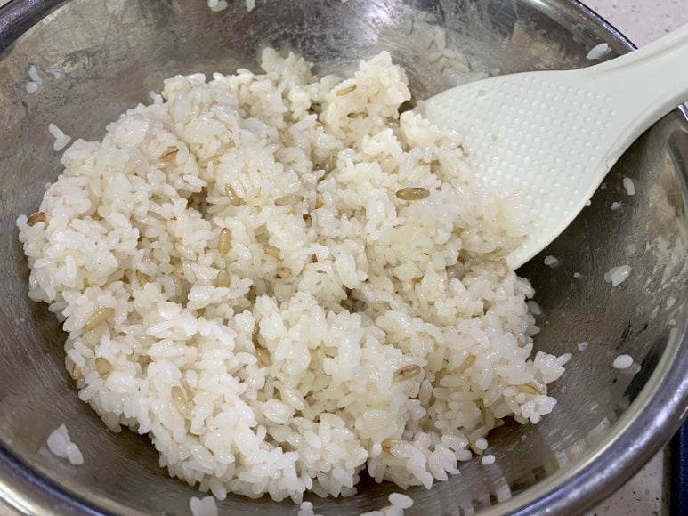 밥을 식혀 준 후에 초밥용소스를 넣어서 잘 섞어 줍니다.