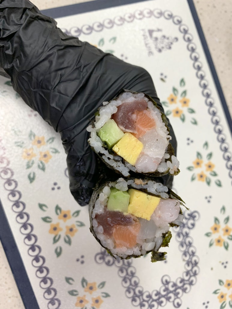 광어회, 연어회, 참치타다끼, 새우회로 만든 후토마끼 완성입니다.