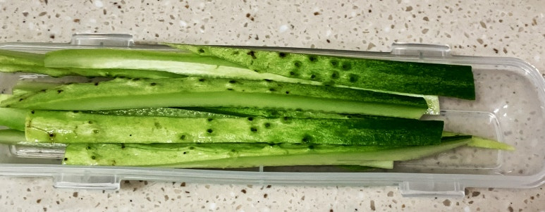오이는 씨부분을 제거하고 똑같이 길쭉하게 썰어 줍니다.