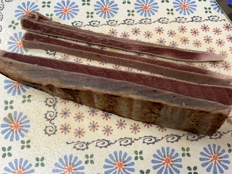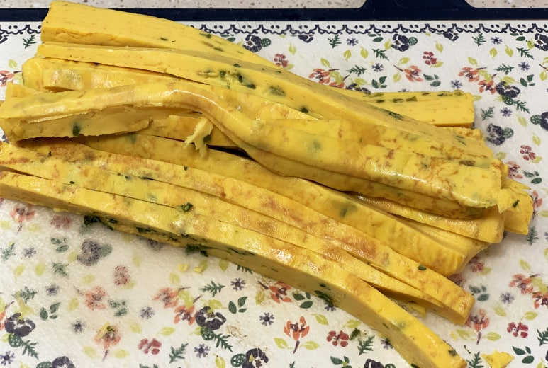 김밥에 들어갈 수 있도록 길쭉하게 썰어 줍니다.