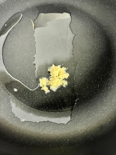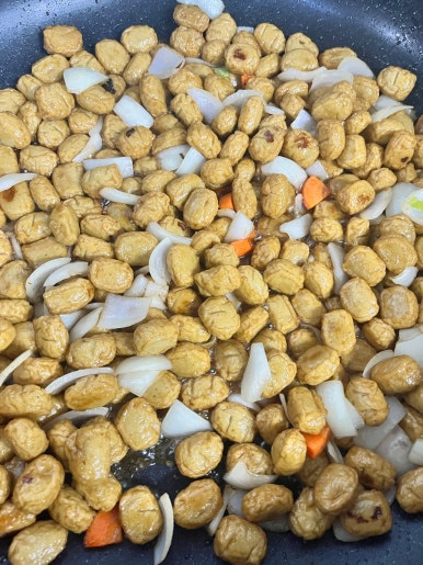 달군 팬에 식용유 1큰술과 다진 마늘 0.5큰술을 넣고 볶습니다. 고소한 마늘 향이 올라오면 썰어둔 양파와 당근을 넣어 함께 볶아주세요.
