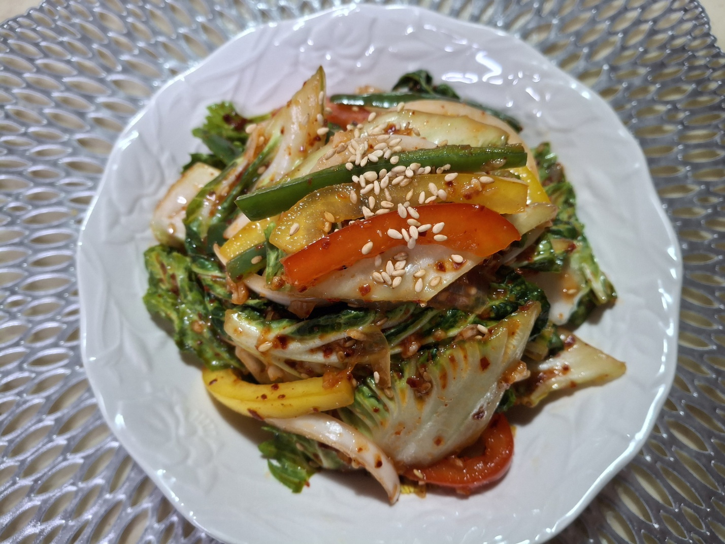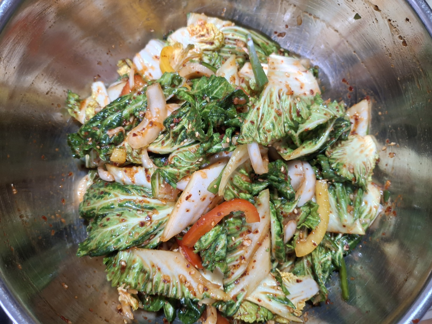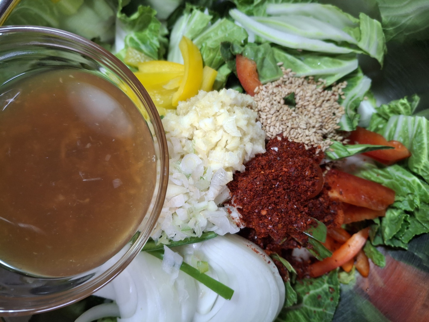 봄동 400g, 양파 100g, 파프리카(빨강ㆍ노란 각) 1/4개, 모닝고추 1개