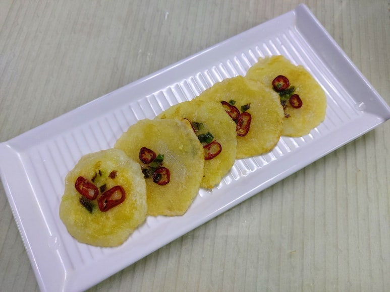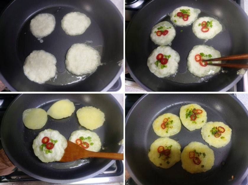 감자전 반죽에 소금을 작은 반 스푼을 넣고 저어요 바삭하게 하기 위해 기름을 많이 넣고 두입 크기 정도로 둥글게 만들어서 썰어놓은 쪽파와 홍고추를 전위에 올려서 예쁘게 만듭니다