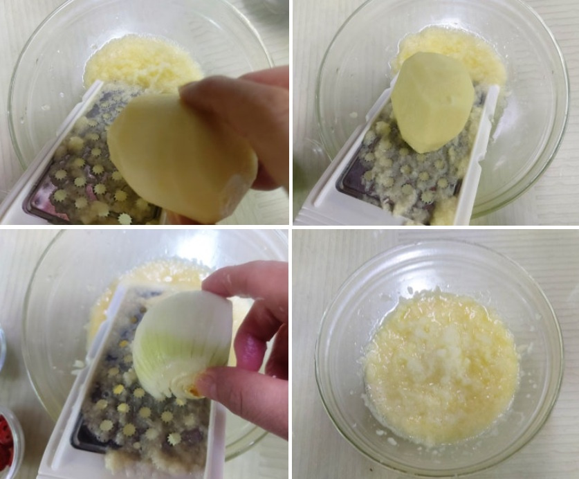 감자 2개를 껍질을 벗겨서 강판에 갈아요 믹서에 갈아도 좋지만 강판에 갈면 식감이 더 좋아요 여기에 양파 1/4쪽도 강판에 갈아서 섞어 놓아요 양파를 넣으면 감자가 갈 변하는 것도 방지하고 양파 향으로 더욱 맛있어요