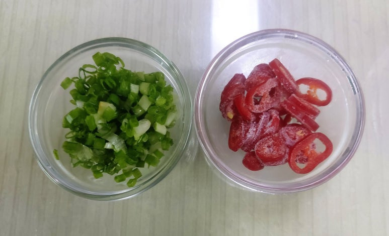 쪽파와 홍고추는 썰어 놓아주세요 홍고추는 냉동실 찬스로 냉동된것 꺼냈어요