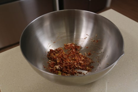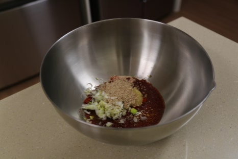 멸치액젓 30ml, 고춧가루 30ml, 다진 마늘 2T, 설탕 2T, 통깨 1T, 참기름 1T