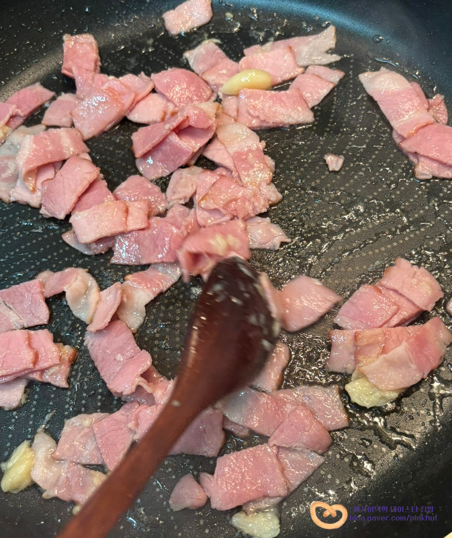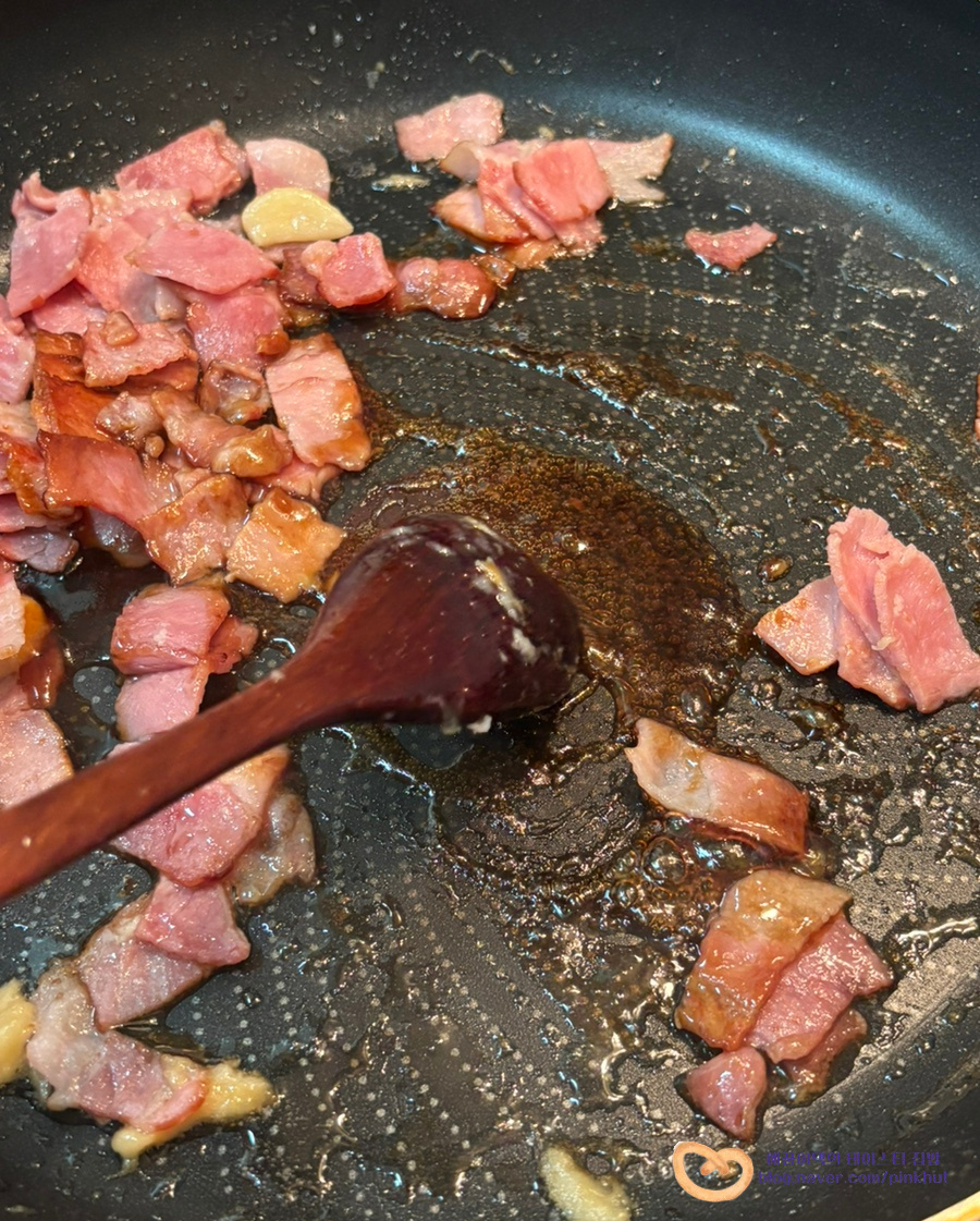 앞뒤로 노릇노릇해질 때까지 볶아주는데요, 햄이나 베이컨, 소세지의 경우 노릇노릇 충분히 구워주어야 담백하고 더 맛있어요.