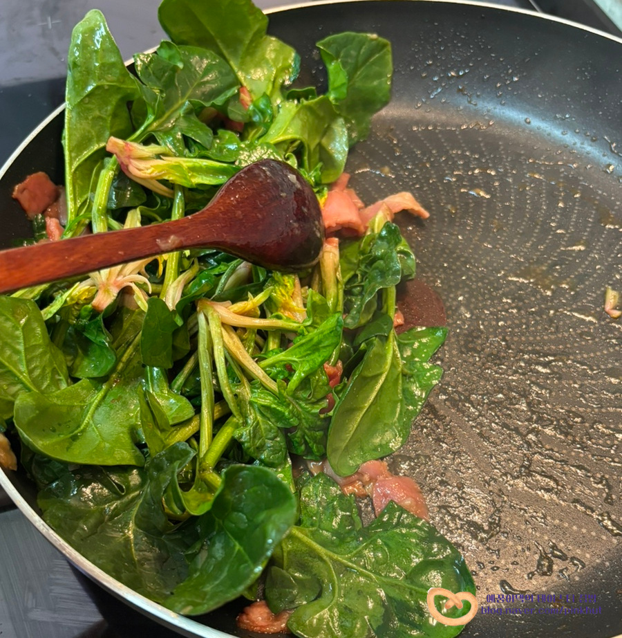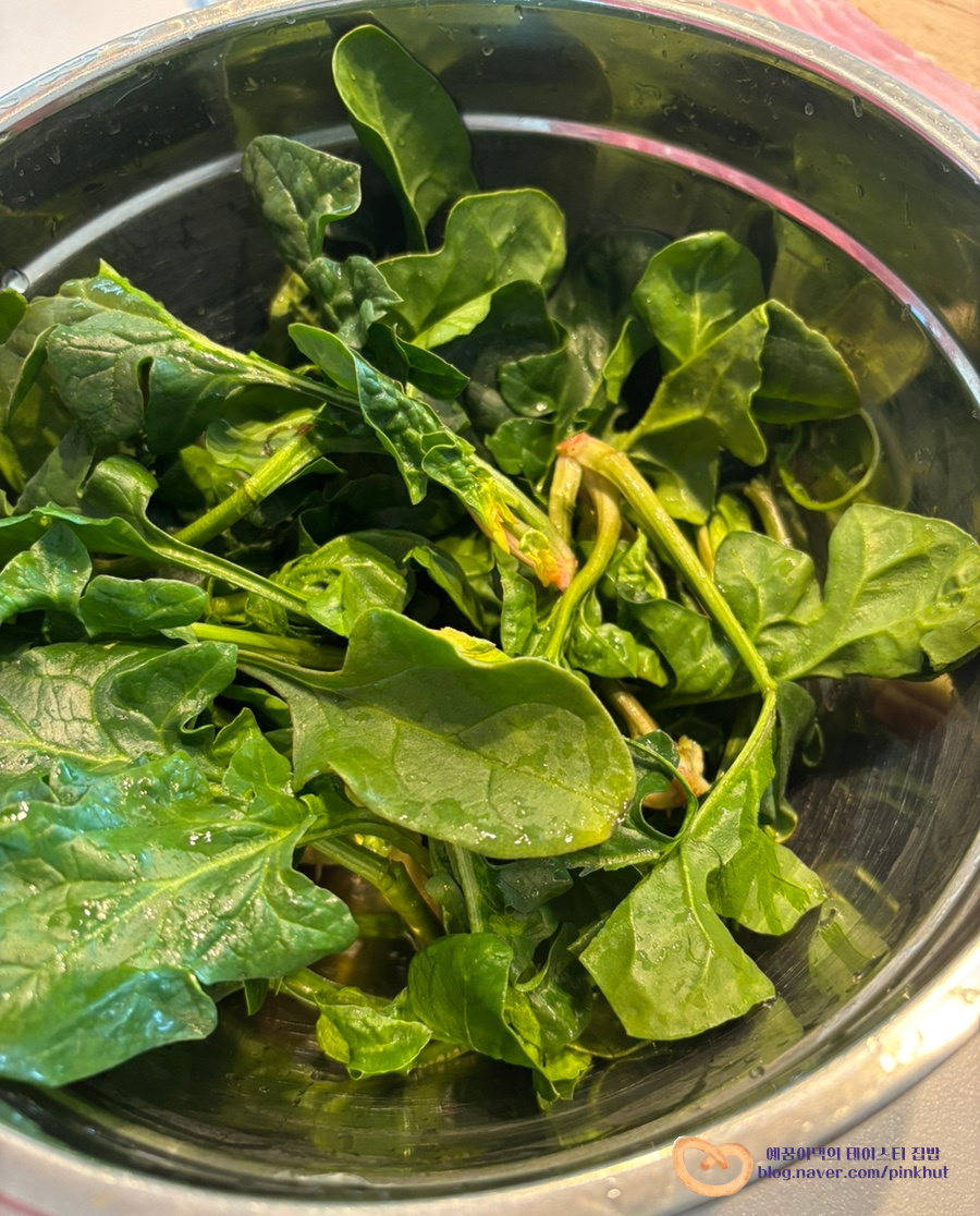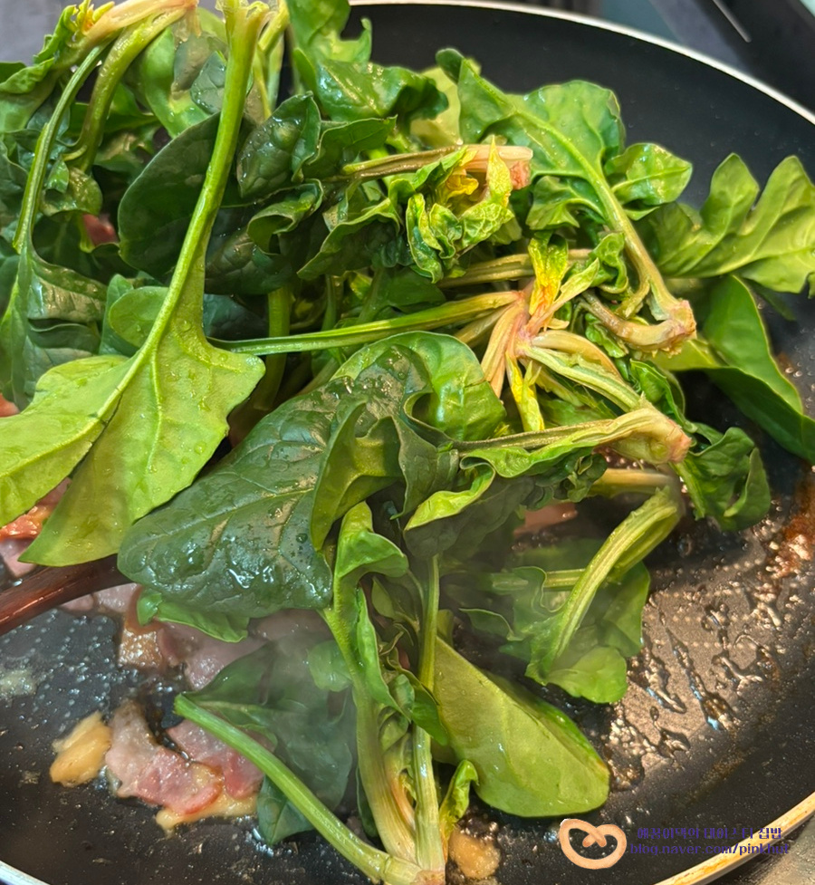 시금치 종류는 잔열로도 금방 익기 때문에 30초 정도만 볶아도 충분해요.