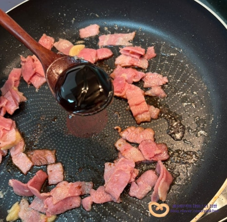 베이컨이 노릇노릇하게 구워졌으면 진간장 1T, 굴소스 1, 설탕 1T, 물 2T를 넣고 T를 넣고 살짝 끓여주세요.
