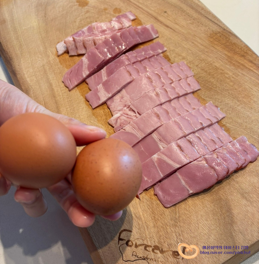 베이컨 6줄은 듬성듬성 먹기 좋게 썰고, 계란 2알도 준비했어요.