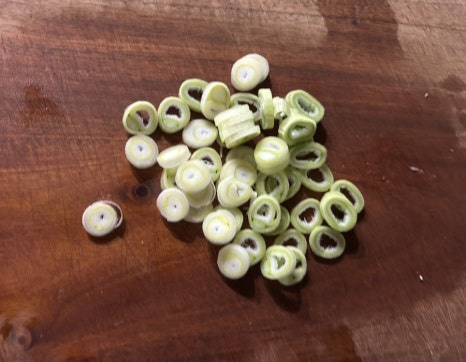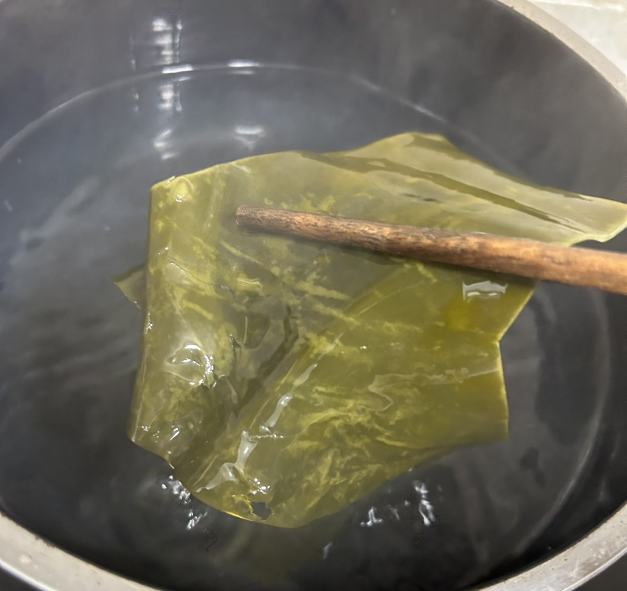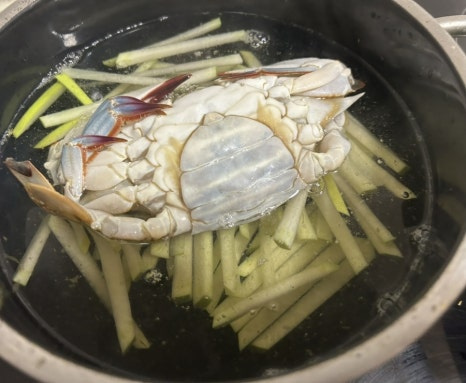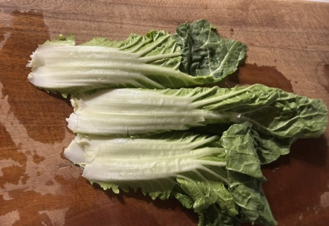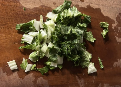 봄동은 겉모습이 뻣뻣해 보이지만 금방 익는 성질이라서 나중에 썰어 넣어 초록의 색감도 살려줘요.