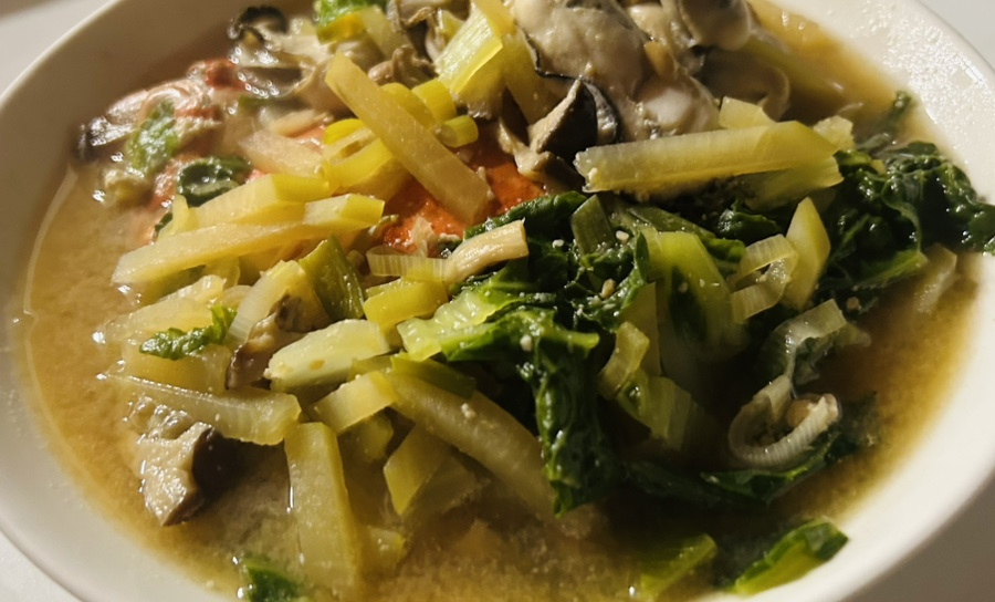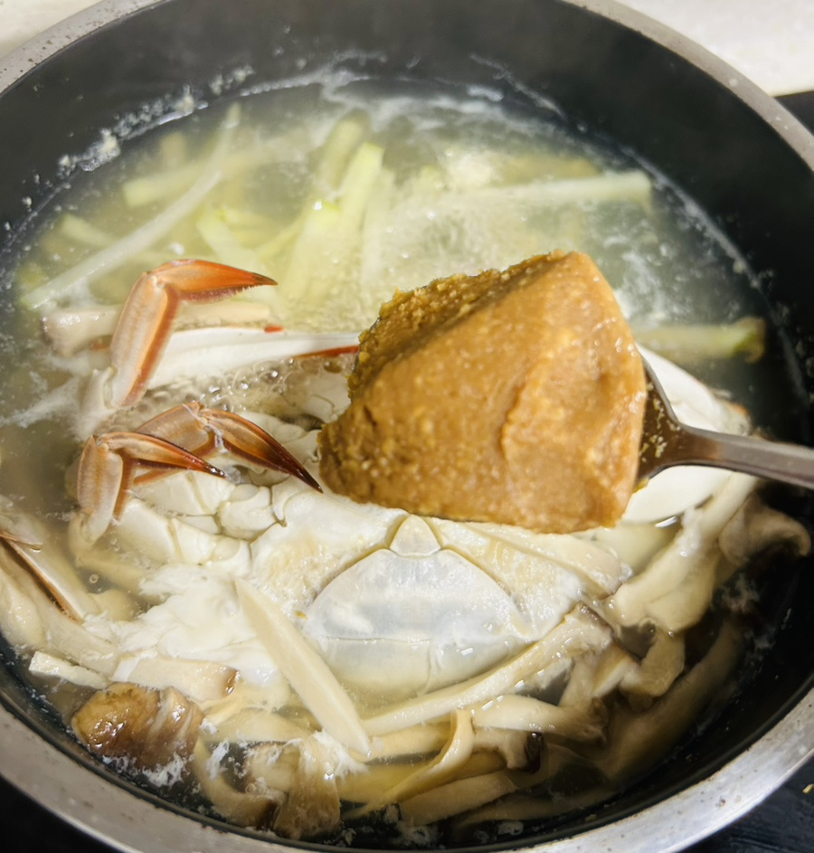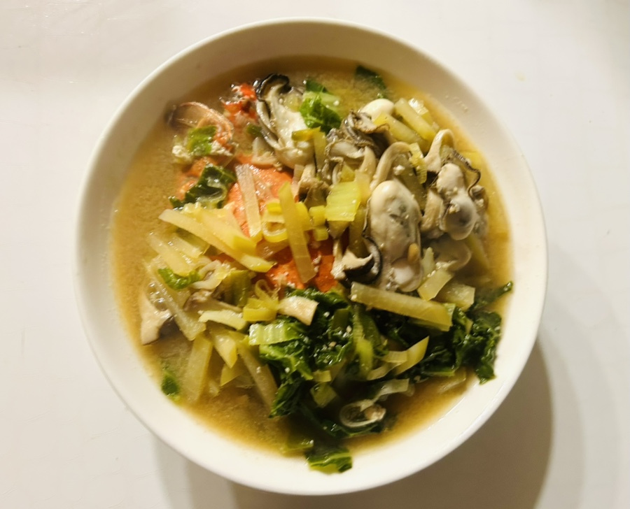 굴도 넣고 냉동이긴 하지만 가을 꽃게 한마리도 퐁당 집어 넣고 파릇한 봄동과 무를 썰어 넣고 순한 맛의 미소 된장을 넣고 구수하면서도 달큰한 굴 봄동 미소 된장국을 끓였어요.
