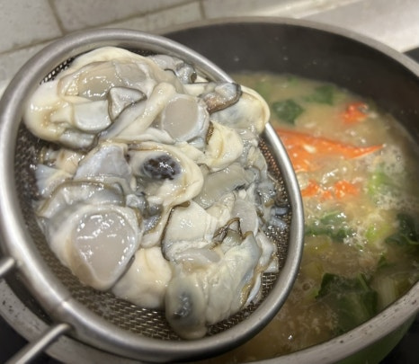 굴도 오래 끓이면 싱싱한 맛이 떨어져서 마지막에 넣고 한소끔 끓여서 굴을 익혀주기만 하면 완성이예요.