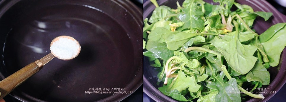 저는 시금치를 두 번 데칠 거라 소금을 조금 넉넉히 넣었어요