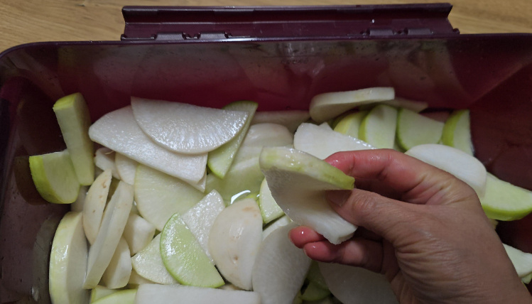 명절 음식이 이어지다 보면 속이 더부룩해질 때가 많지요. 이럴 때 빠질 수 없는 것이 바로 시원한 동치미입니다. 보통 동치미는 오래 숙성해야 한다고 생각하지만, 오늘 소개하는 레시피는 **2일이면 바로 먹을 수 있는 ‘금방 먹는 동치미’**로 명절 상차림은 물론, 고기 요리·전·느끼한 음식과 환상적인 궁합을 자랑합니다. 과일과 육수로 깊은 맛을 더해 처음 담가도 실패 없는 동치미 레시피, 지금부터 소개해 드릴게요.