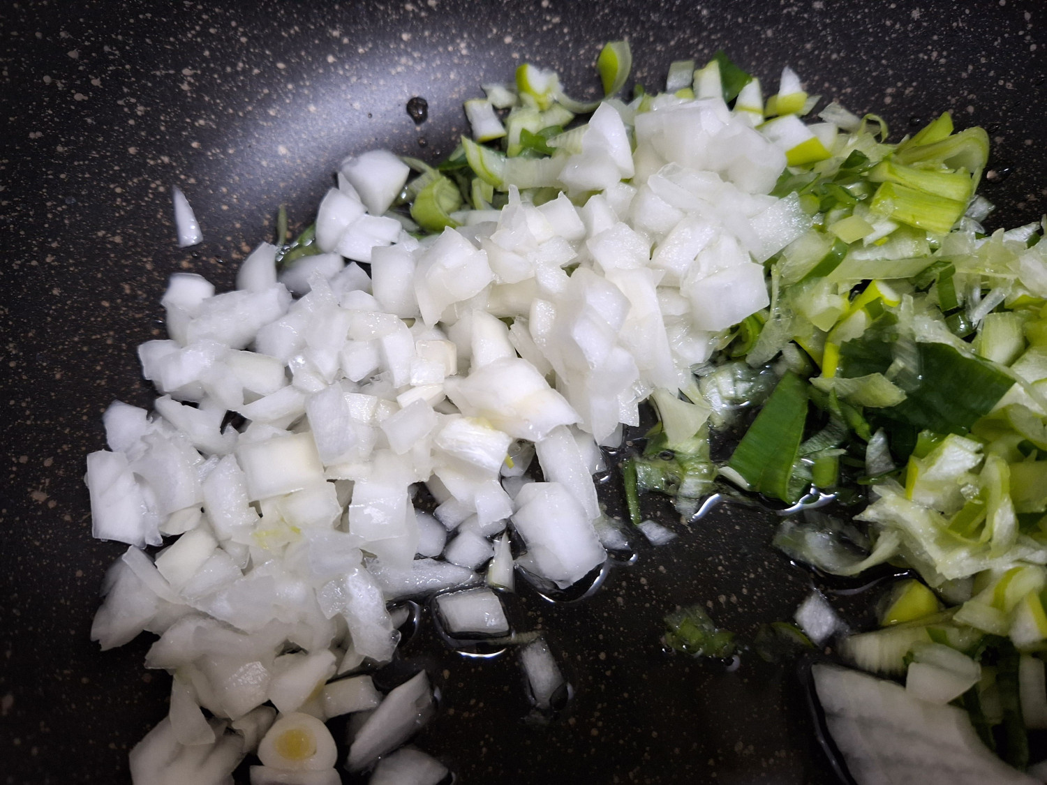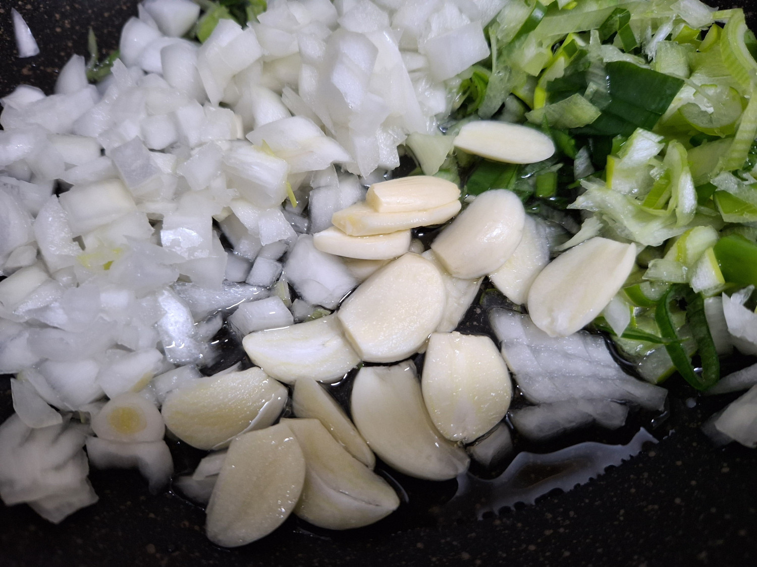 두부 한모 , 대파 1 개 , 양파 1/4 개 , 통마늘 6 개 , 들기름 1 숟갈 , 밥 두공기 , 맛소금 한꼬집 , 후추 1/2 티스푼