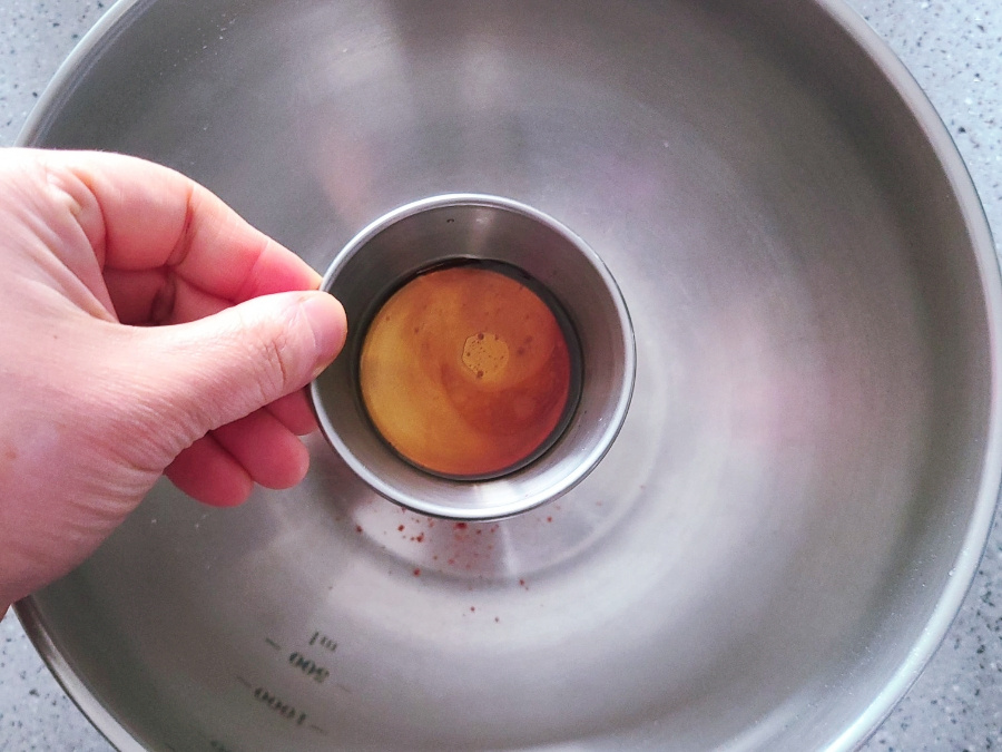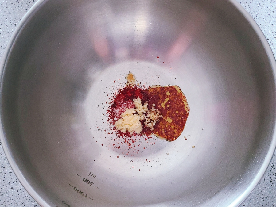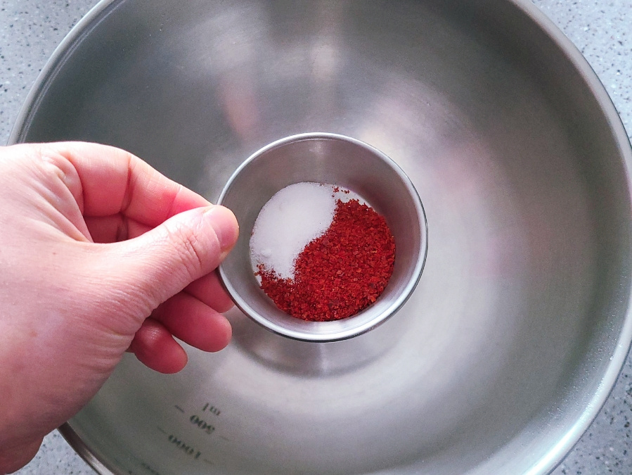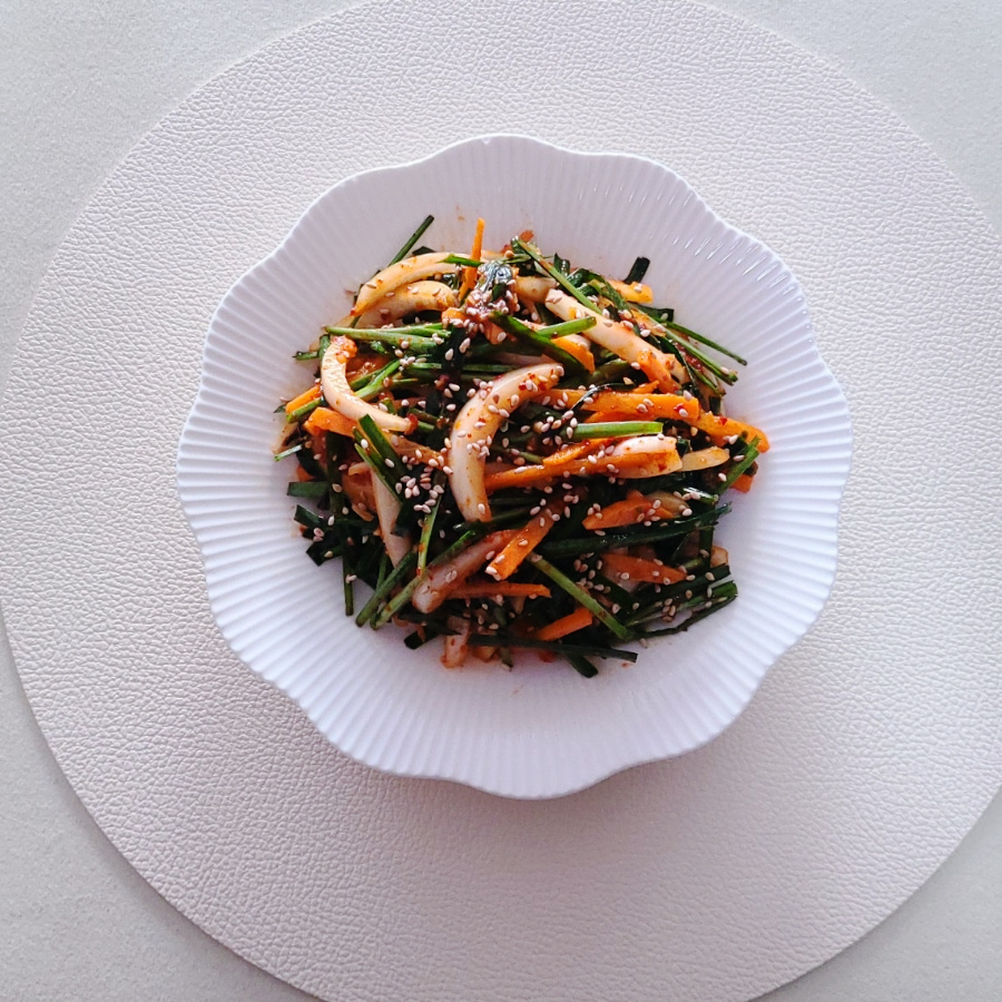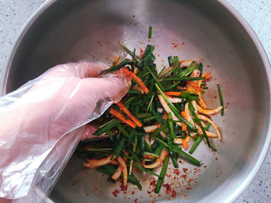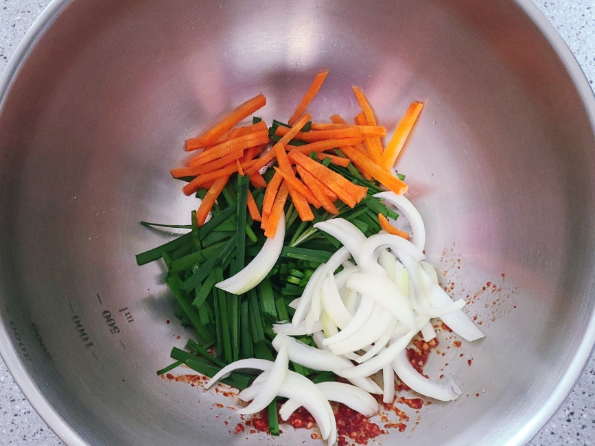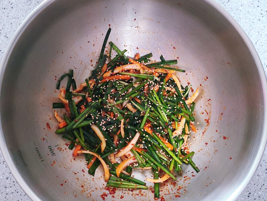 부추 손질 후 50 g , 양파 35 g , 당근 20 g , 다진마늘 0.3 큰술 , 고춧가루 0.8 큰술 , 설탕 0.25 큰술 , 참치액 0.5 큰술 , 진간장 0.5 큰술 , 참기름 0.5 큰술 , 통깨 솔솔솔