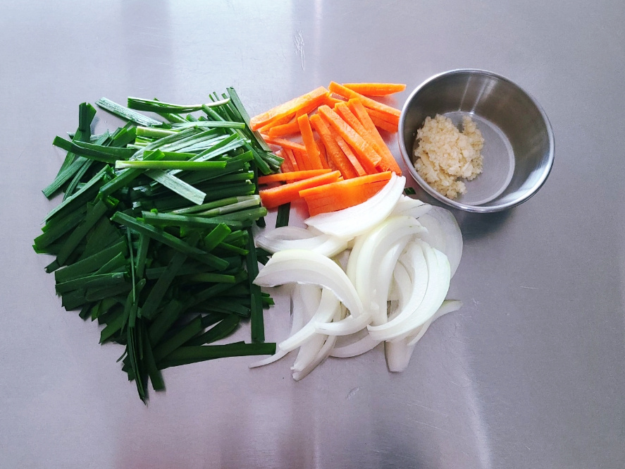 세척한 부추는 지저분한 부분을 먼저 손질하고 3~4cm 정도 길이로 자르고, 당근과 양파는 2mm 정도 두께로 채 썰고, 다진마늘 0.3큰술을 준비합니다.