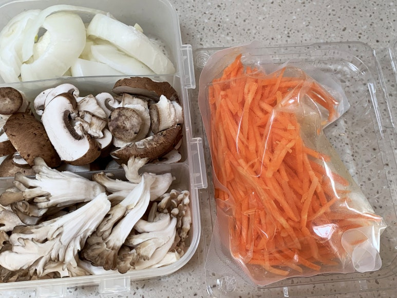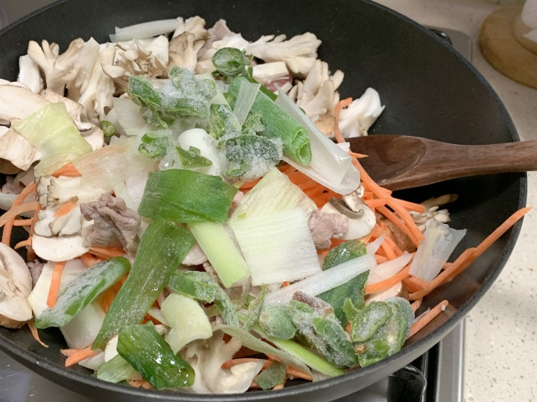 들어간 재료는 잎새버섯, 갈색양송이버섯, 양파, 당근채, 대파입니다.