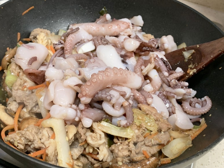 낙지를 넣어서 함께 잘 볶아 줍니다.