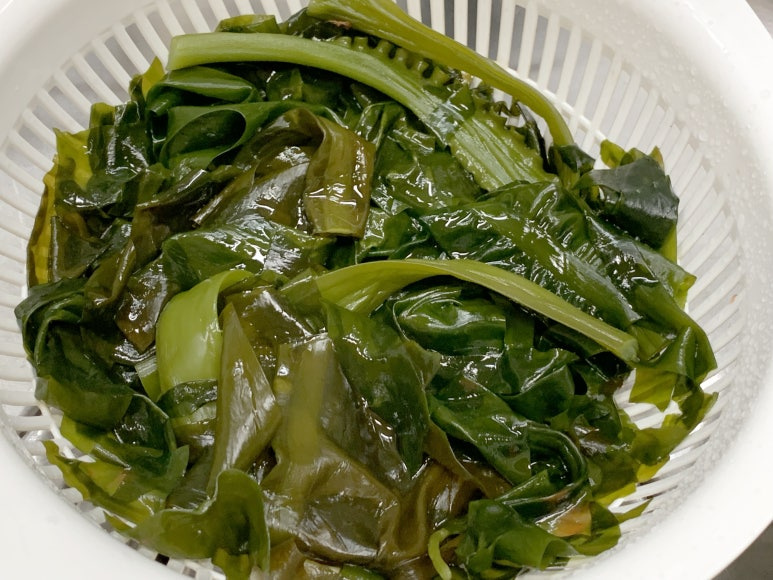 물미역을 팔팔 끓은 물에 살짝만 데쳐 줍니다.