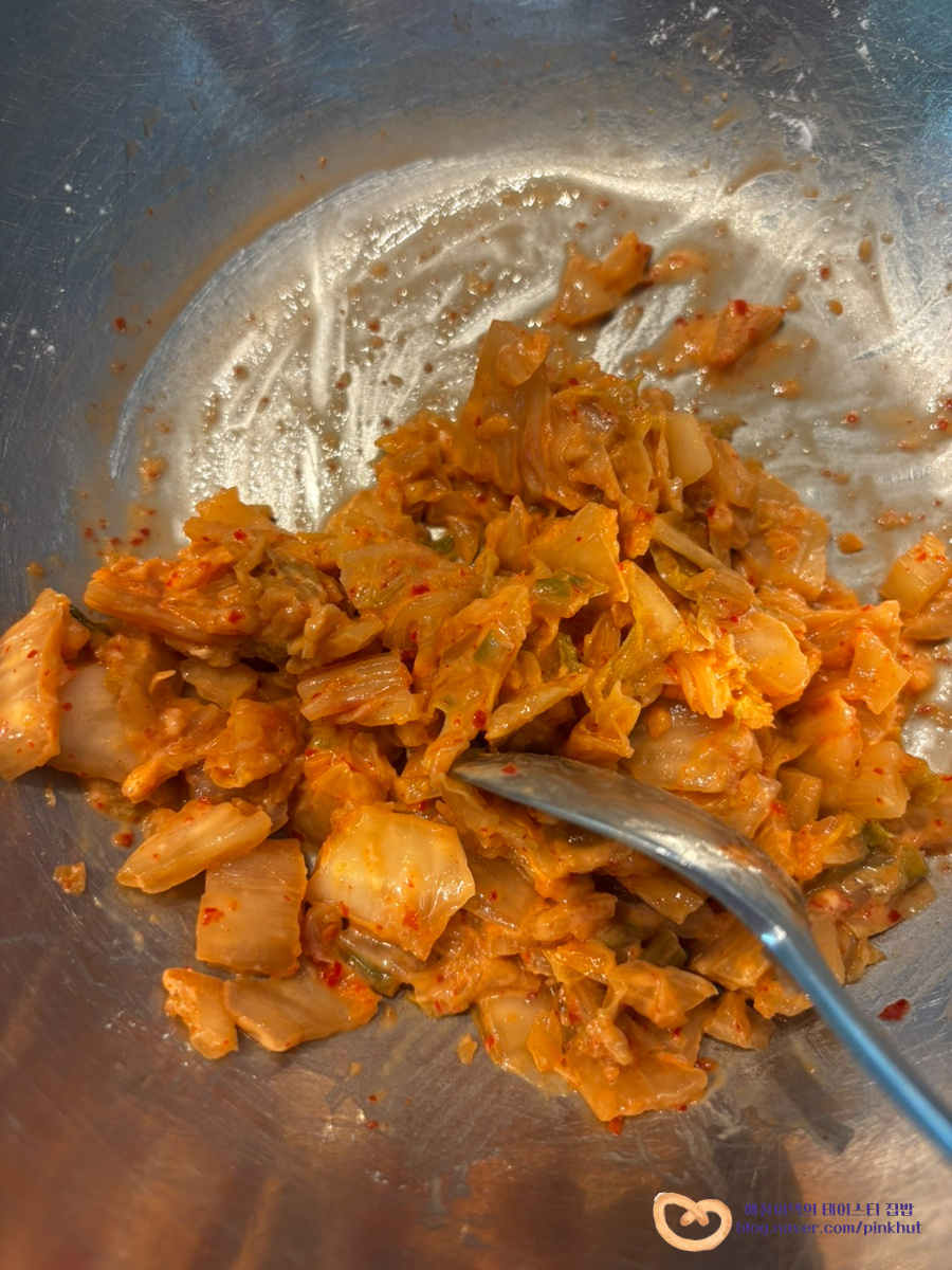 묵은지는 100g을 준비했어요. 가볍게 양념 훑어내고, 가위로 먹기 좋게 잘게 썰어줍니다.