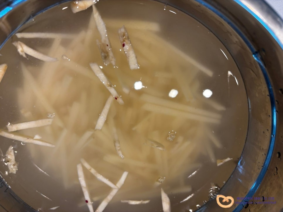 채 썬 고구마는 지근한 물에 담가 10분간 담가주고, 10분 후에 물기를 빼 내어 주세요.
