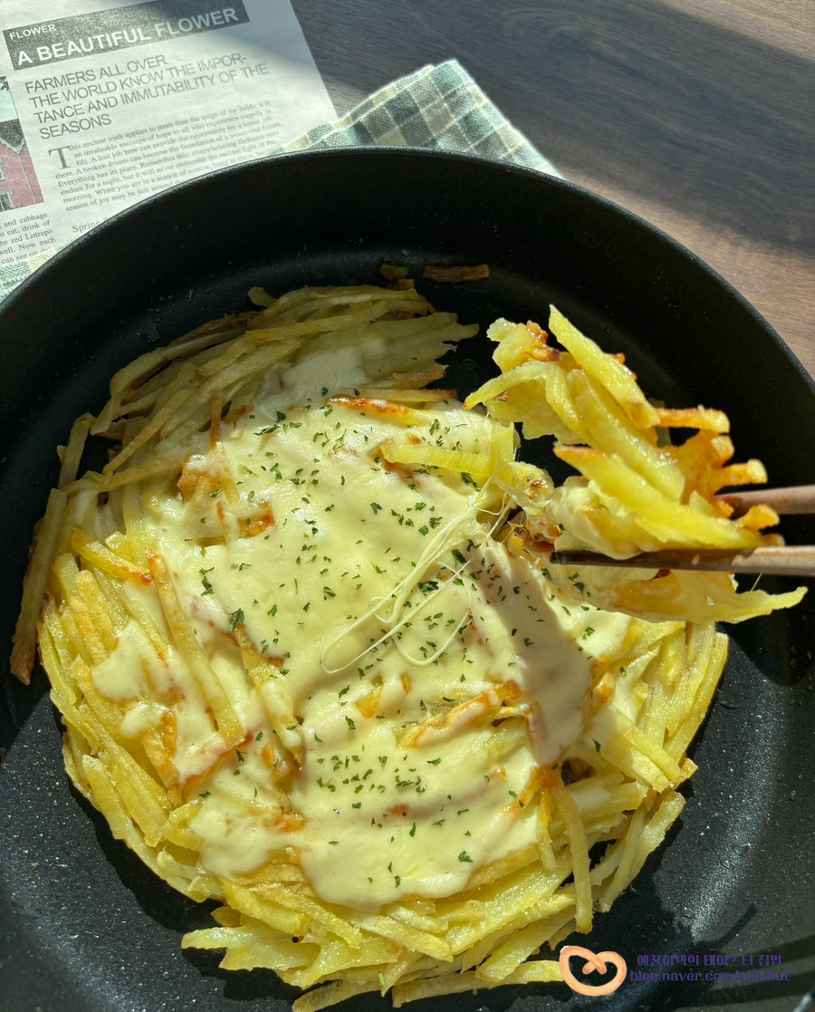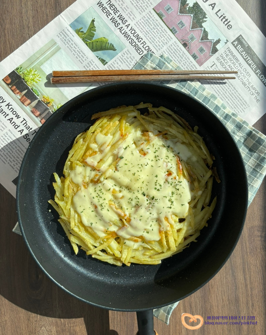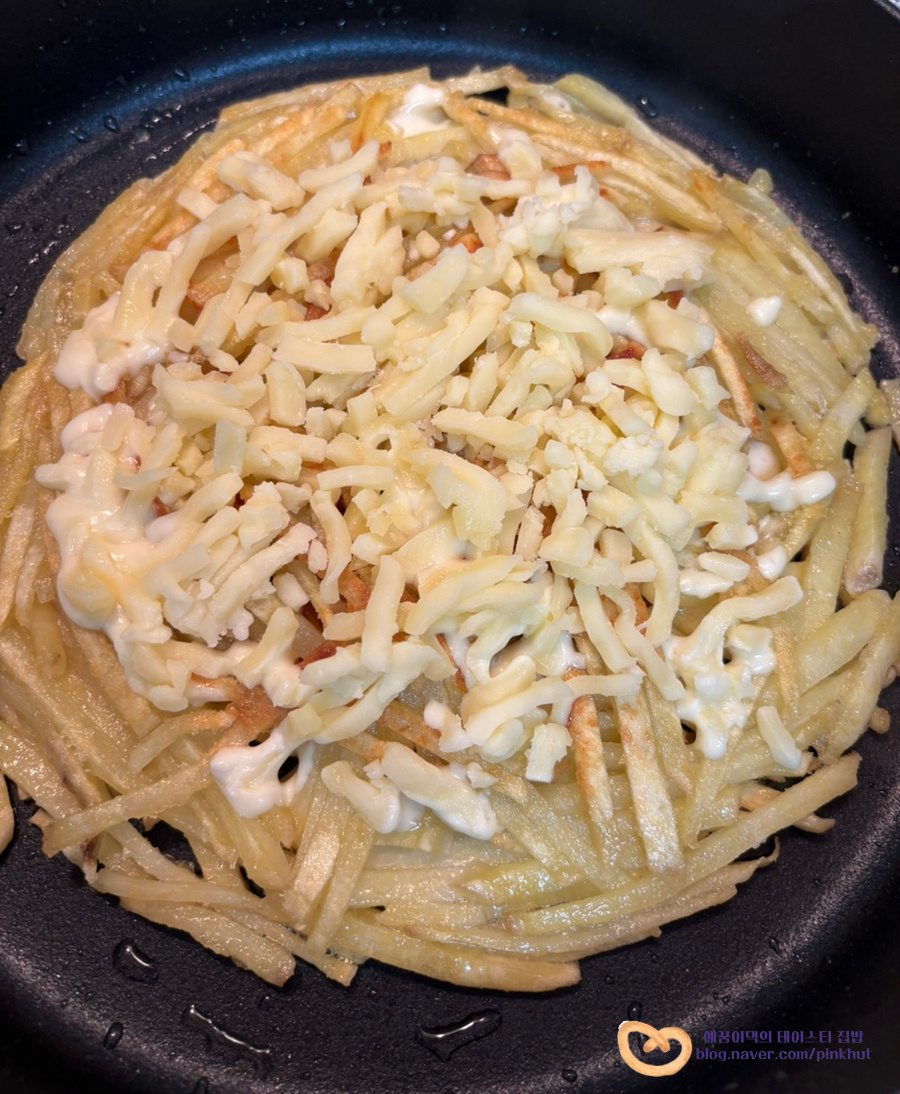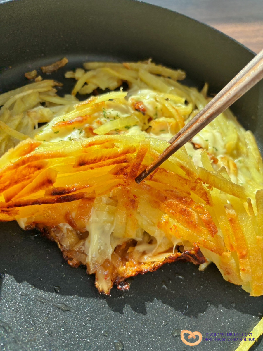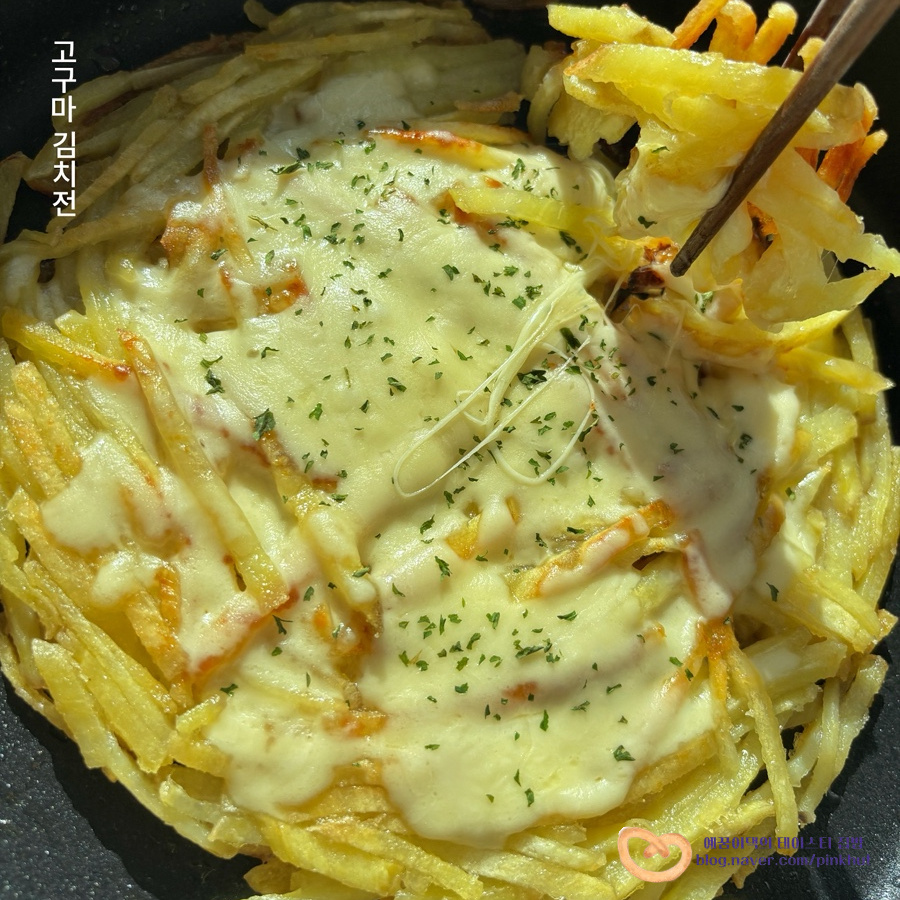 윗면은 모짜렐라치즈 듬뿍 올려진 바삭바삭 고구마 부침개 비주얼이고요,