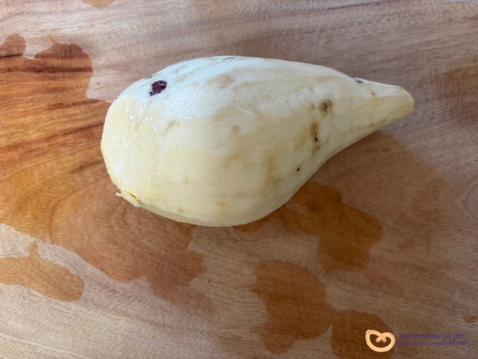 감자 필러로 껍질을 깔끔하게 제거하고요, 얇게 슬라이스해 주세요. 감자채볶음 만들 때보다 조금 더 얇게 썰어주었어요