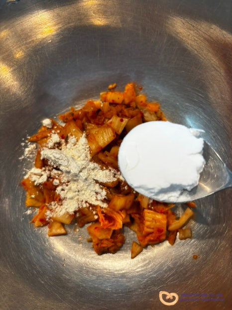 볼에 썰어 둔 김치, 전분가루 1T, 부침가루 1T, 물 1T를 넣고 골고루 섞어주세요. 반죽 가루가 보이지 않을 정도로 섞어주시면 됩니다. 밀가루, 물을 많이 넣으실 필요 없어요.