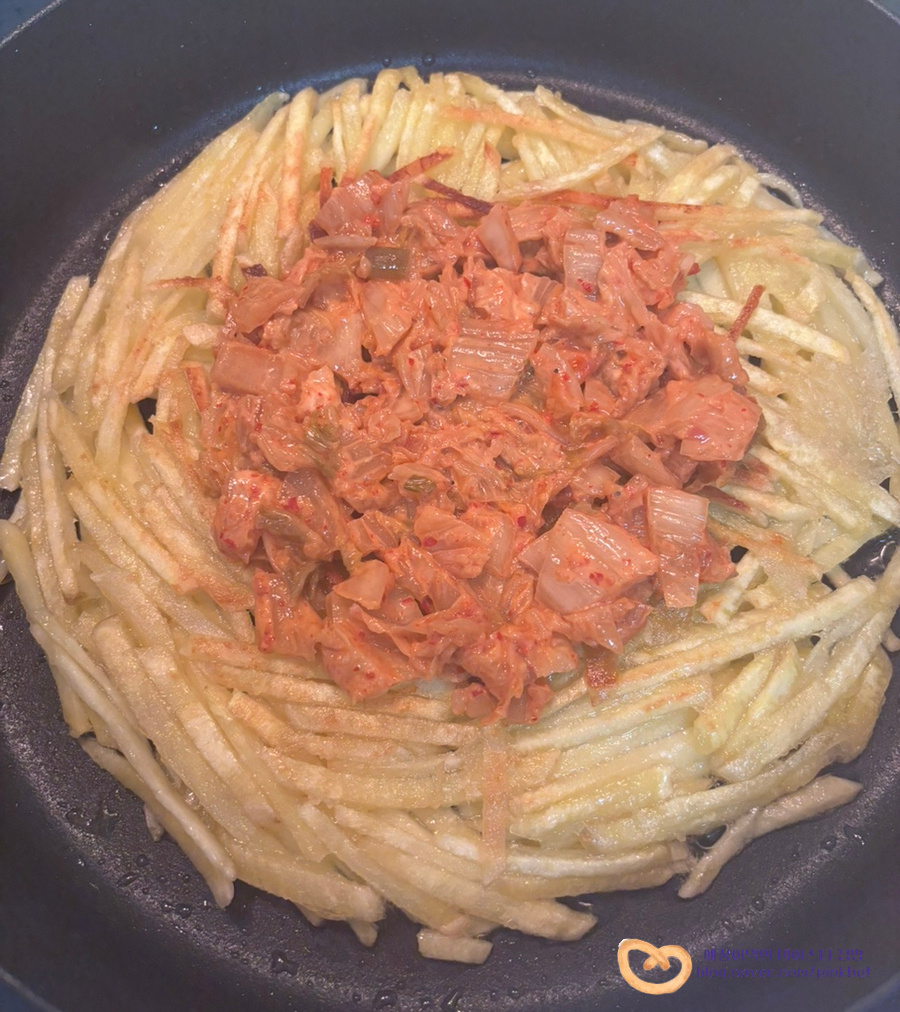재료 준비가 끝났으면 고구마 김치전 맛있게 부쳐볼까요?ㅎㅎㅎ