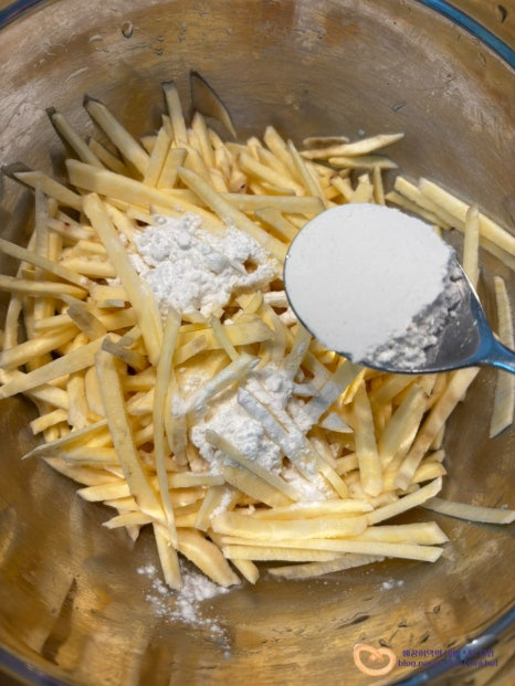 물기를 빼 둔 고구마채에 전분가루 2T, 부침가루 2T를 넣고요 물 2T 넣어줍니다.
