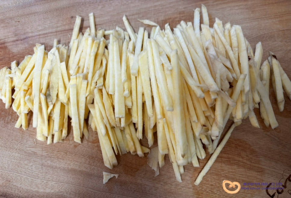 슬라이스한 뒤에 동일한 두께감으로 얇게 채 썰어줍니다. 일정한 두께로 채 썰어주면 재료들이 잘 엉겨 붙어 바삭하고, 균일하게 잘 익게 돼요