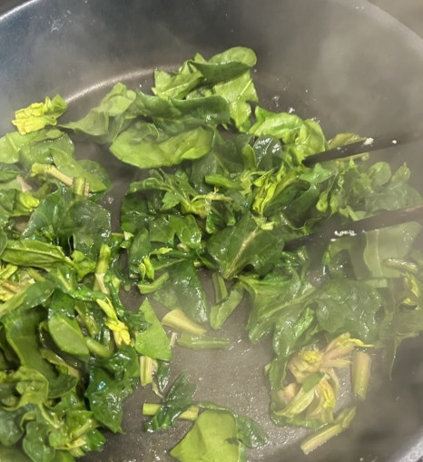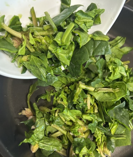 시금치가 살짝 숨이 죽을 정도로 볶아 주세요.