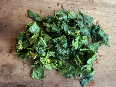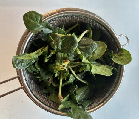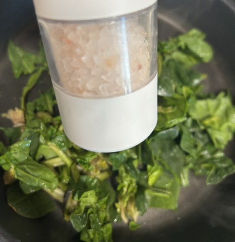 계란을 건져 낸 후라이팬에 버터 한조각 넣고 녹여 준 뒤 시금치를 넣고 소금 1꼬집 넣고 볶아 주세요.