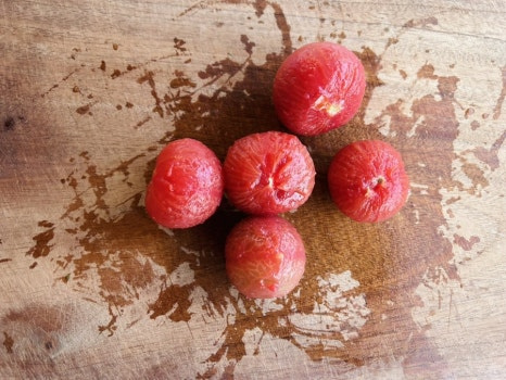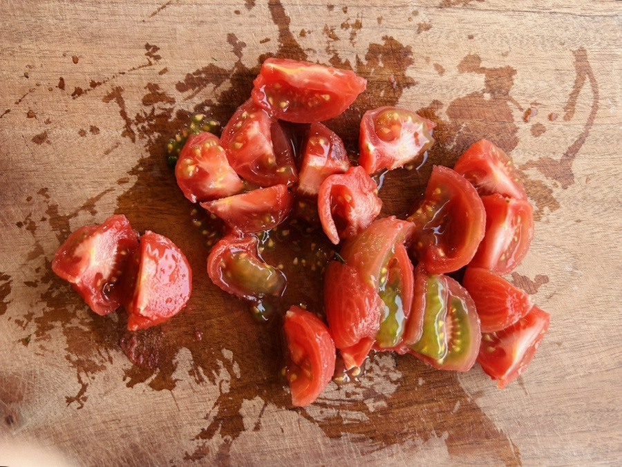 토마토가 크다면 한입 크기로 작게 썰어 주세요.