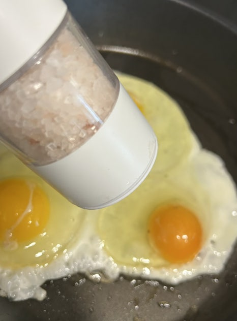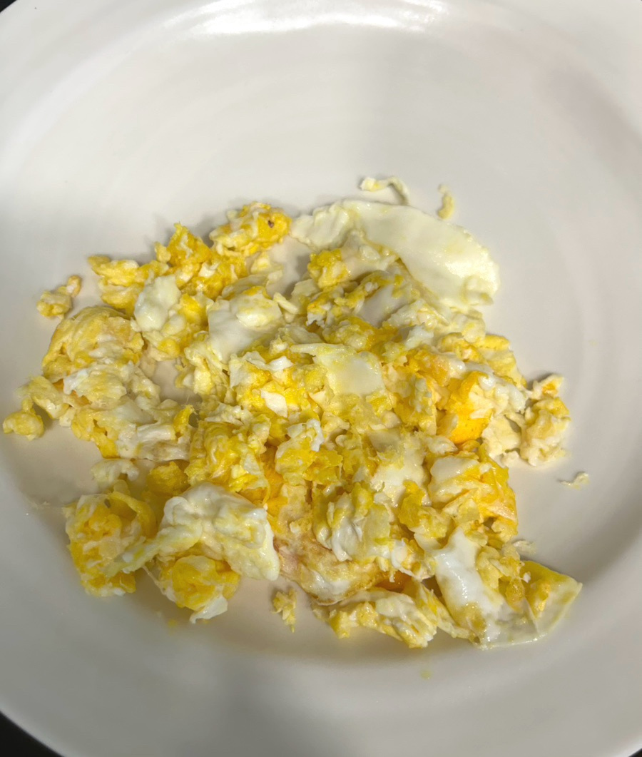 후라이팬에 오일 코팅해주고 계란 3개를 넣고 중약불에서 밑부분을 부드럽게 익혀준 뒤 40-50프로 정도 익으면 소금 1꼬집 넣고 젓가락으로 휘저어 스크램블드에그를 만들어 주세요.
