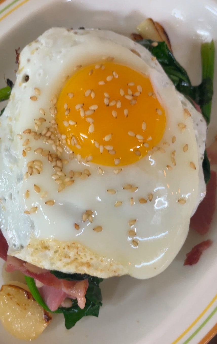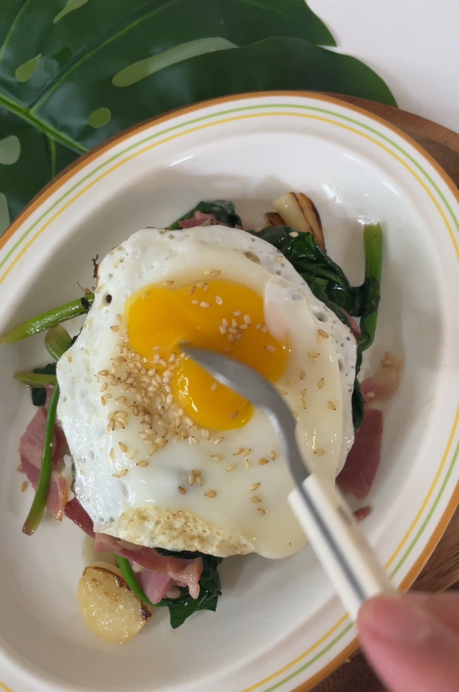 계란이 있다면 계란프라이 만들어서 시금치베이컨덮밥 위에 올려도 좋아요.