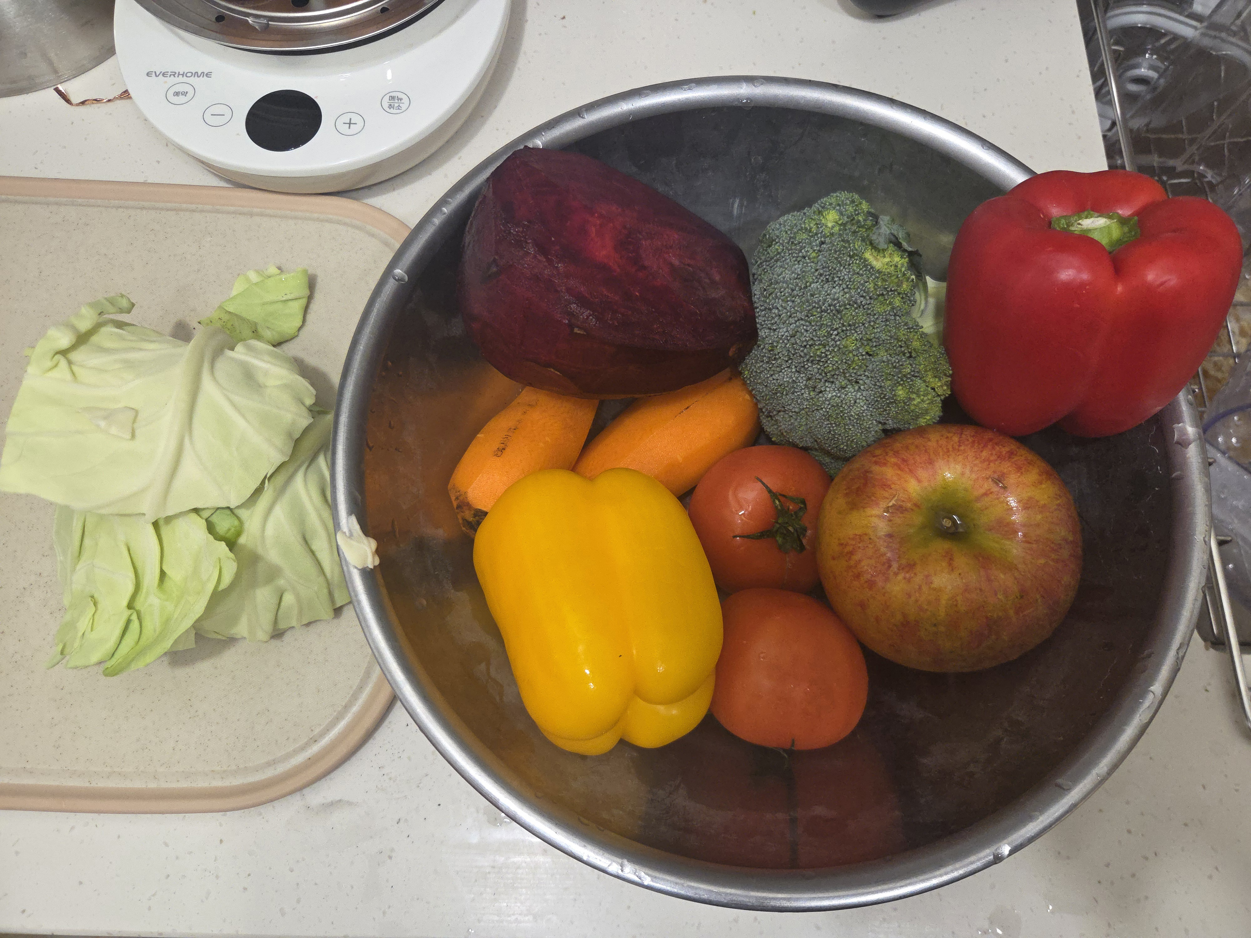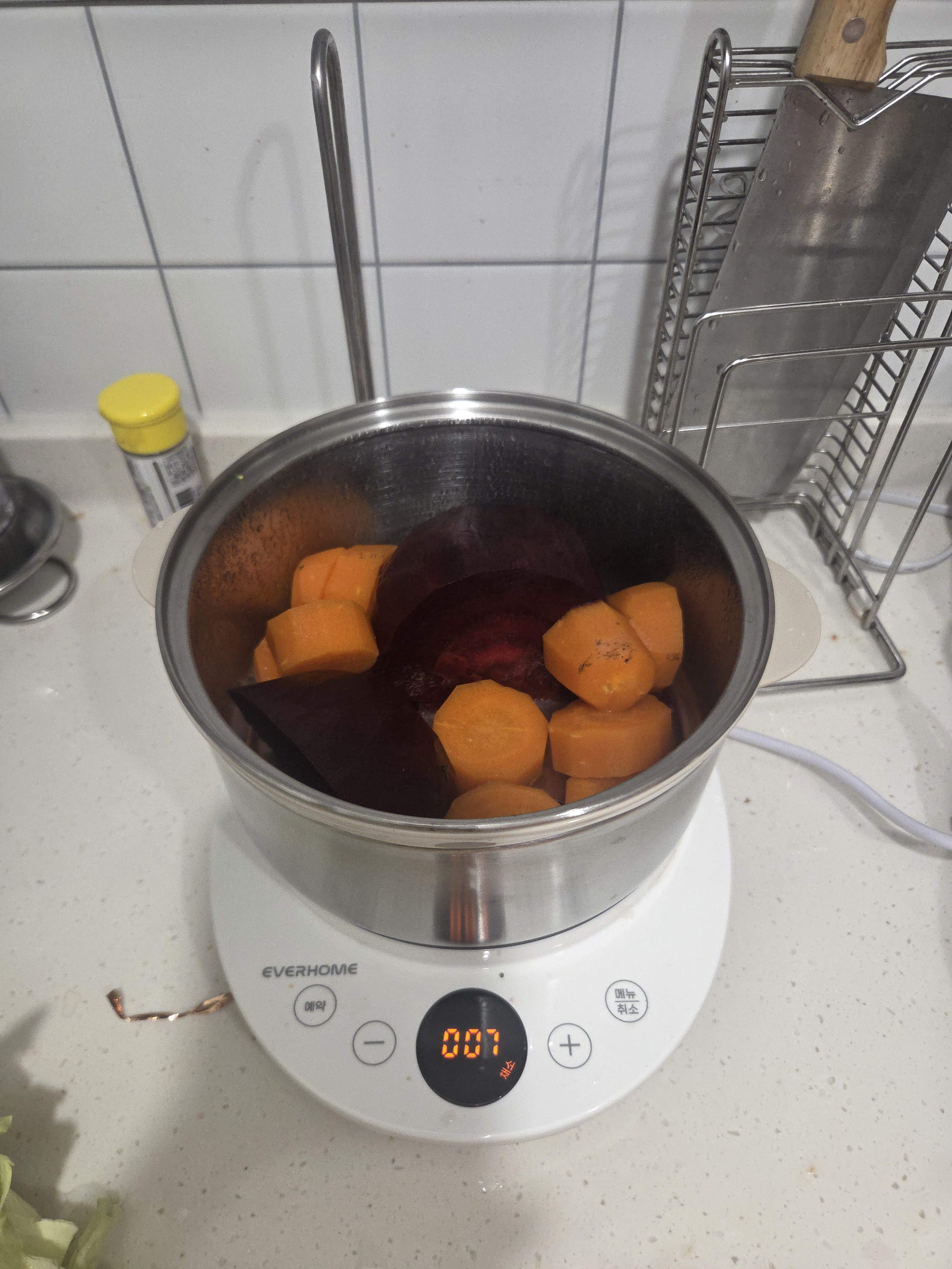 비트와 당근 양상추는 푹 찌고 브로콜리와 토마토는 나중에 쪄줍니다.
